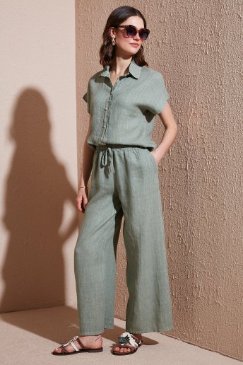 Çizgili Regular Fit Yüksek Bel Geniş Paça Keten Bayan Pantolon 4998RN544 HAKİ