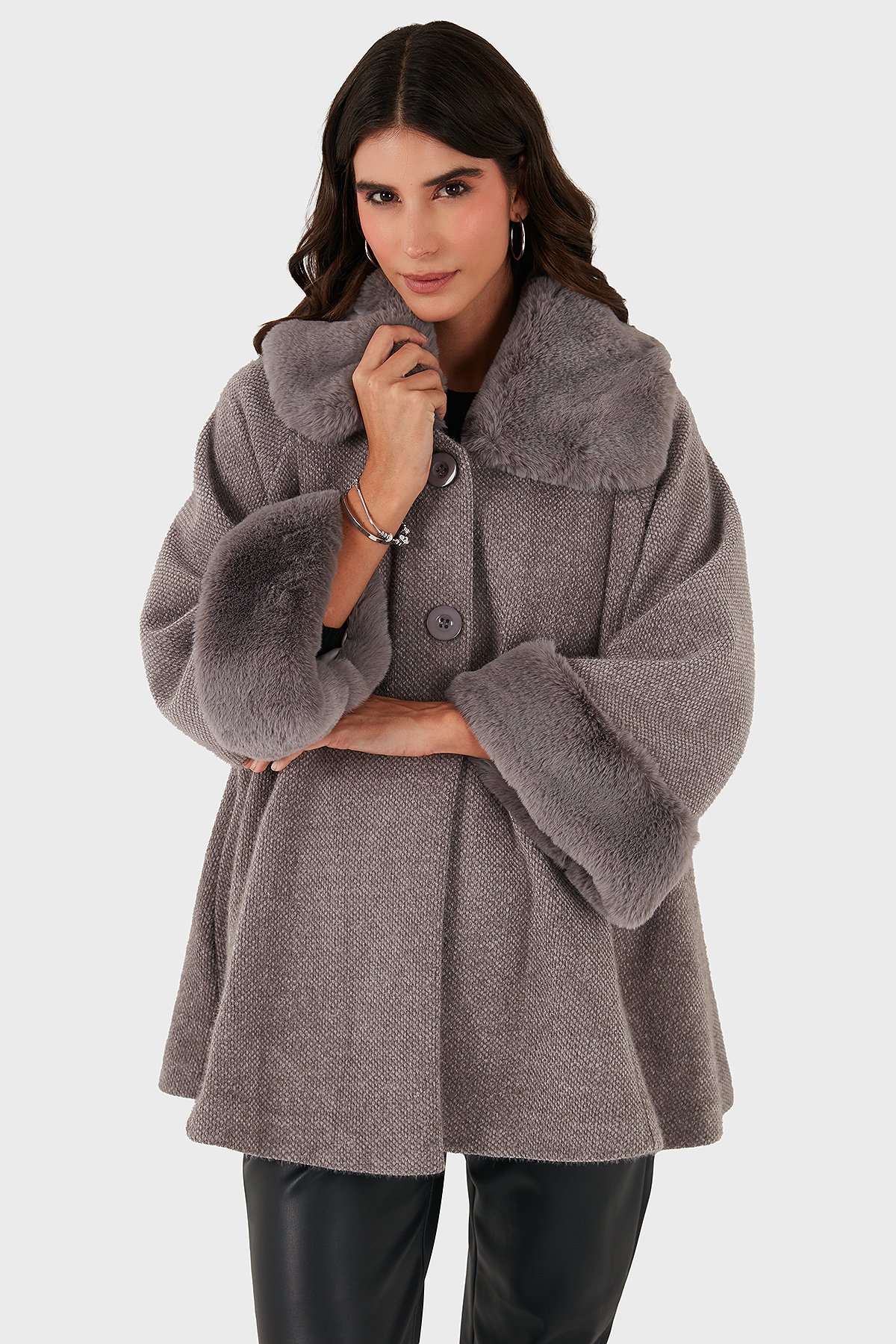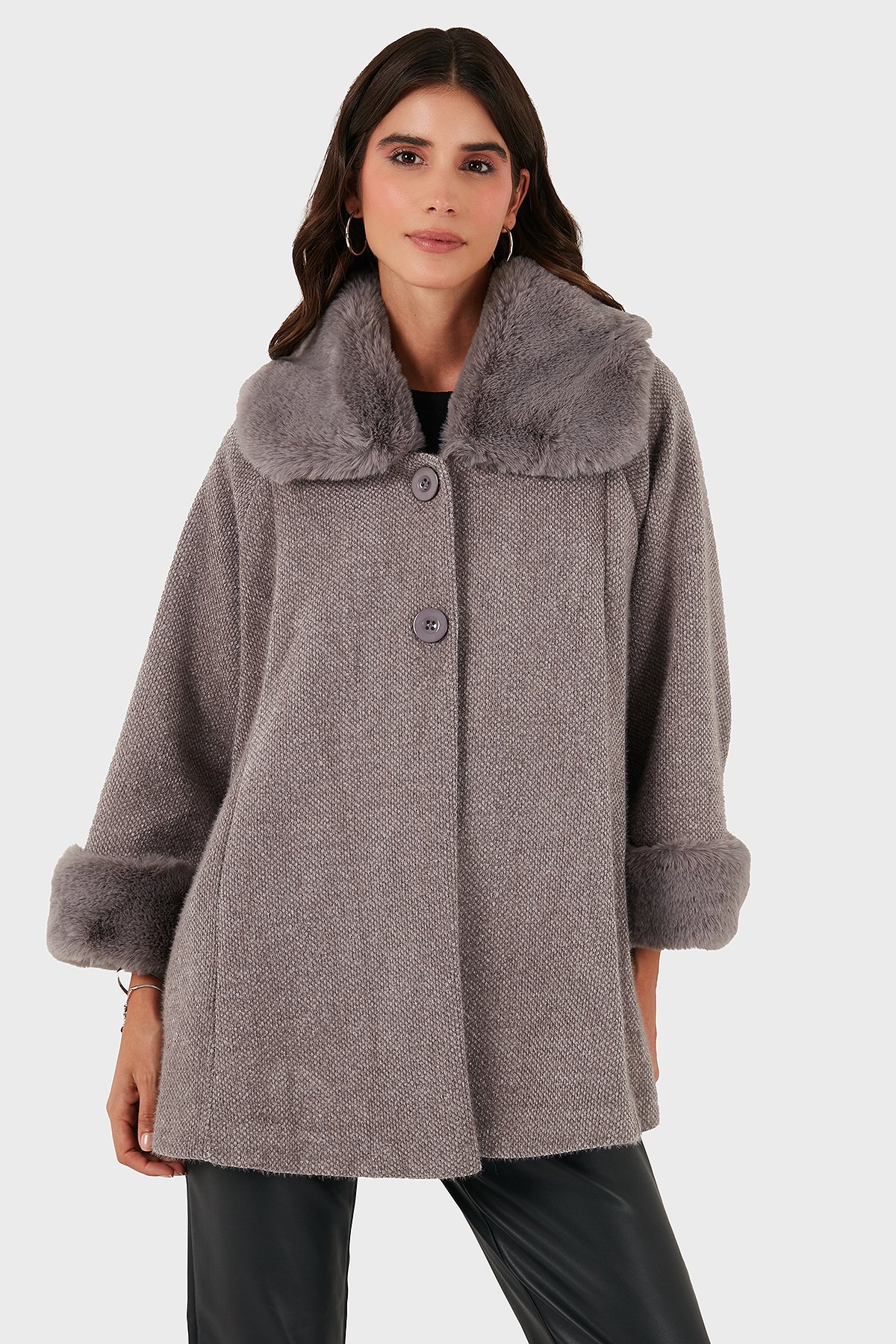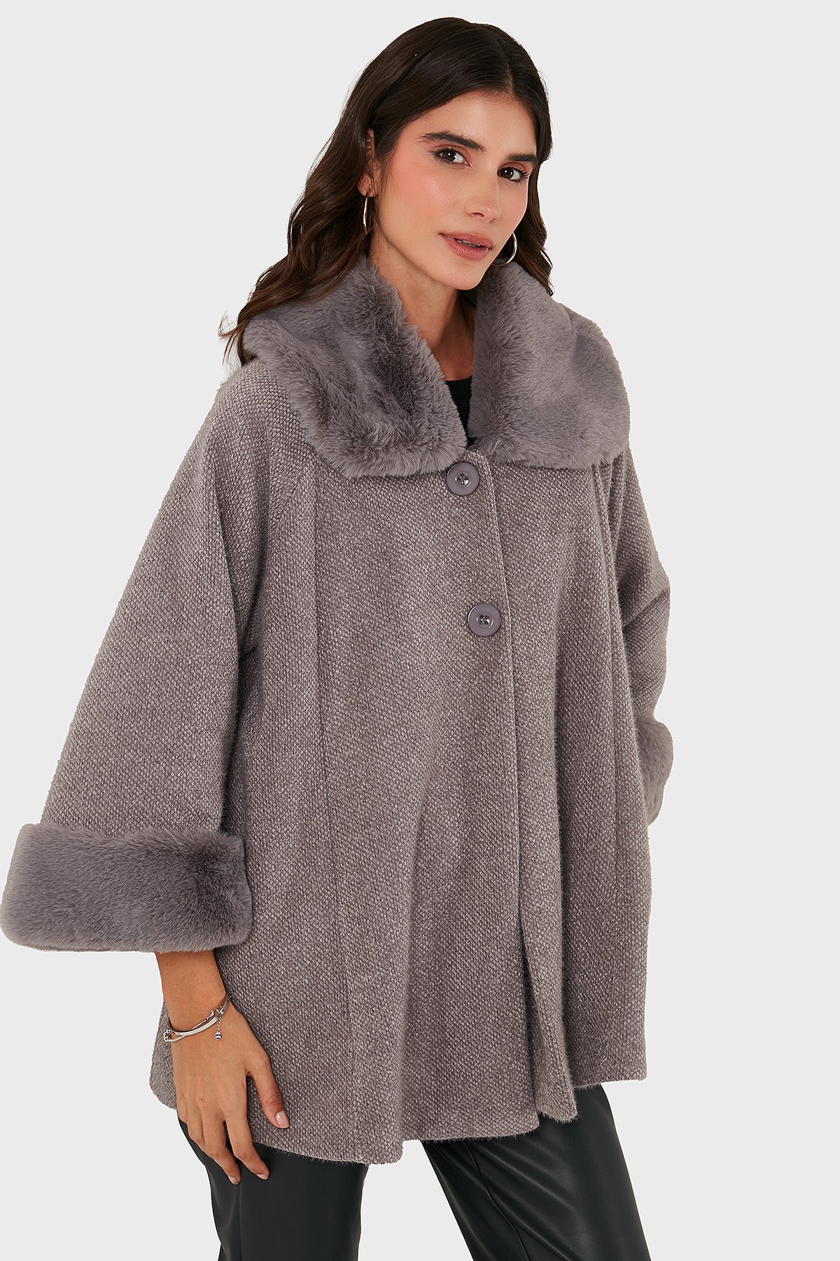 Oversize Fit Ceket Yaka Düğmeli Kürk Bayan Mont 6858060 GRİ