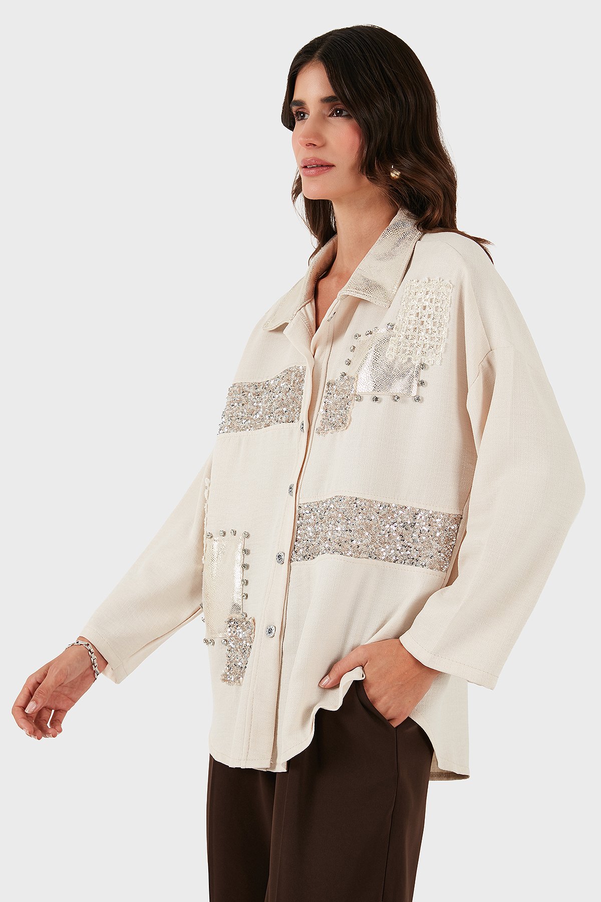 Oversize Fit Pul Detaylı Uzun Kollu Bayan Gömlek 69143120 BEJ