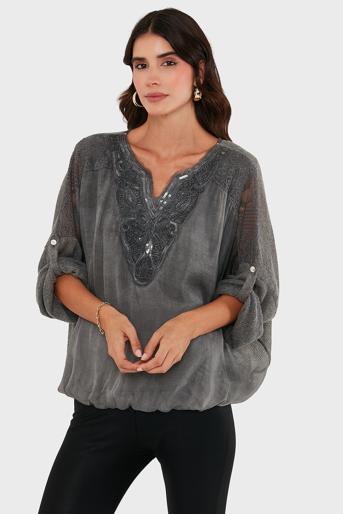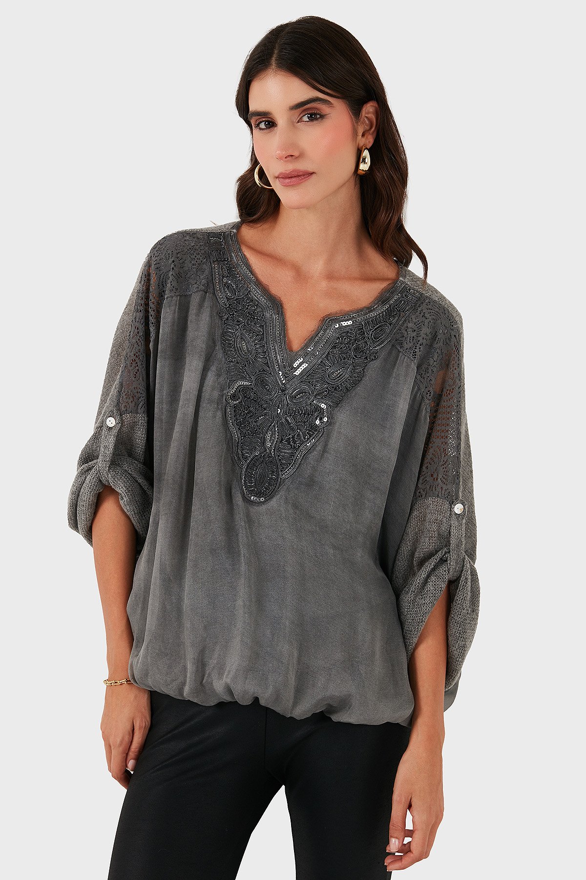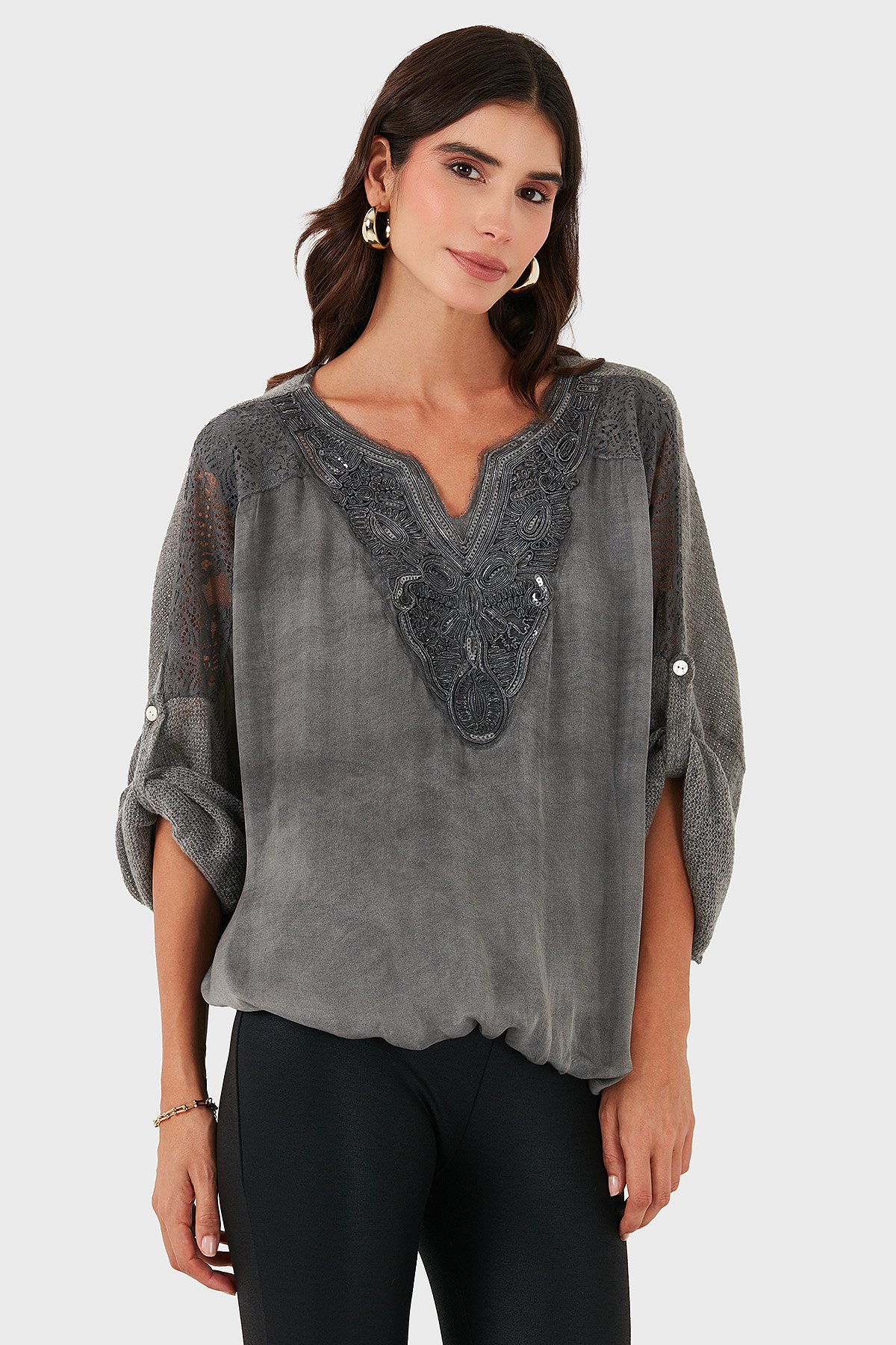 Oversize V Yaka Pul Dantel Detaylı Bayan Bluz 690822 ANTRASİT