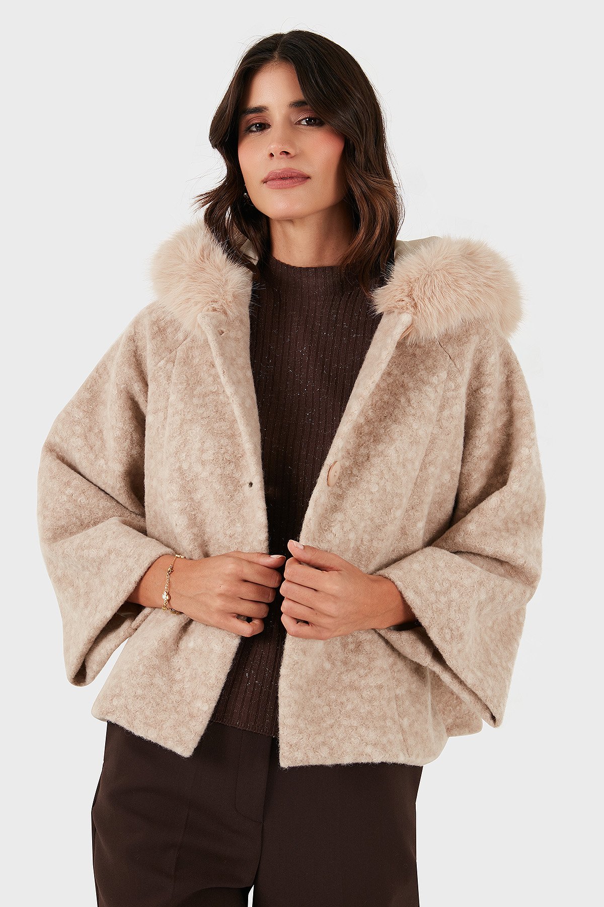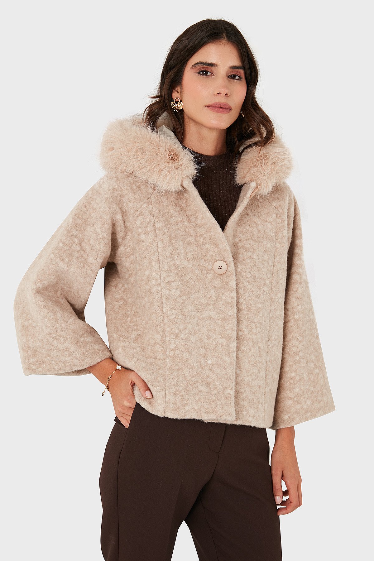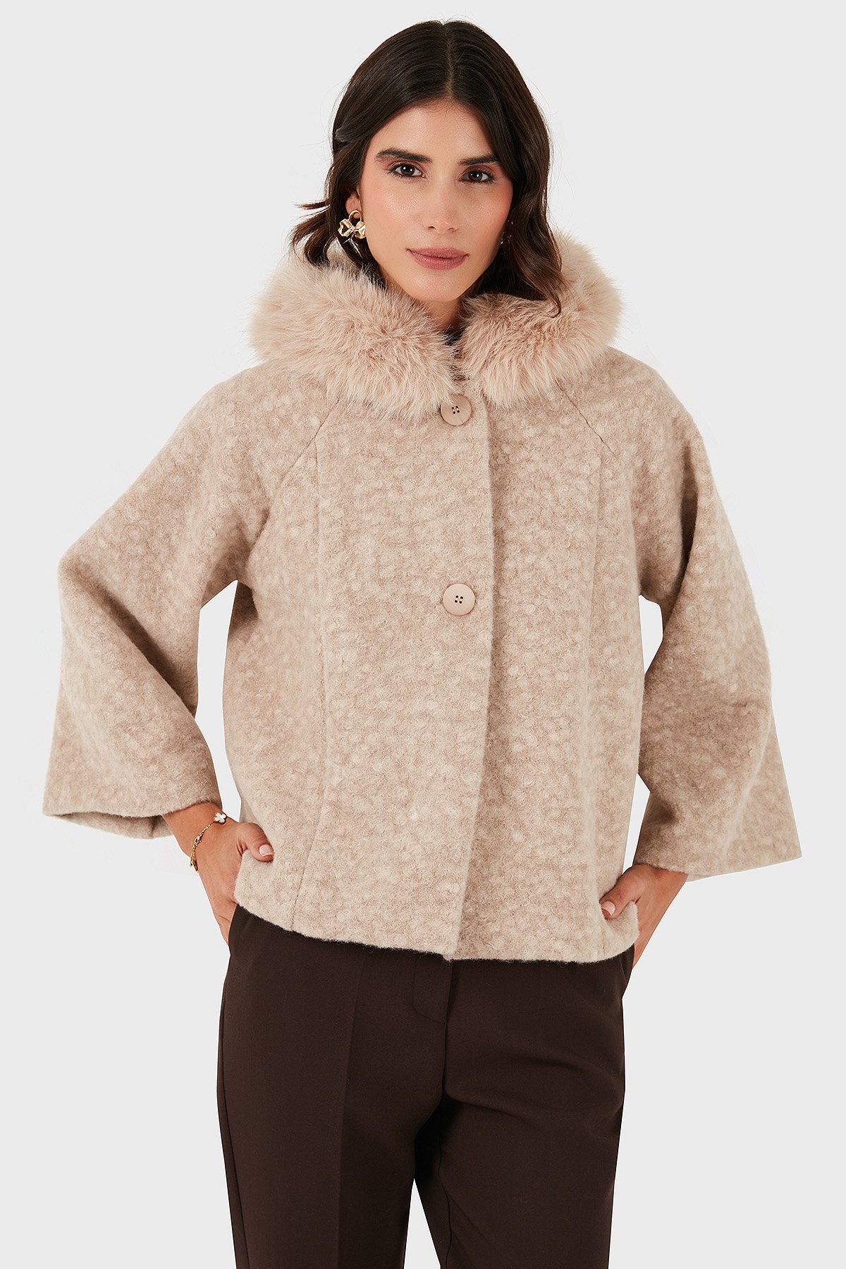 Oversize Yumuşak Tüylü Kapüşonlu Truvakar Kol Astarlı Bayan Mont 690919 BEJ