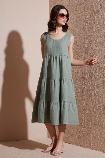 Regular Fit Bisiklet Yaka Volanlı Midi Keten Bayan Elbise 7202544 HAKİ