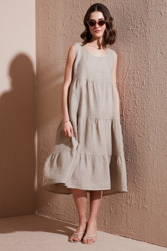 Regular Fit Bisiklet Yaka Volanlı Midi Keten Bayan Elbise 7202687 TAŞ