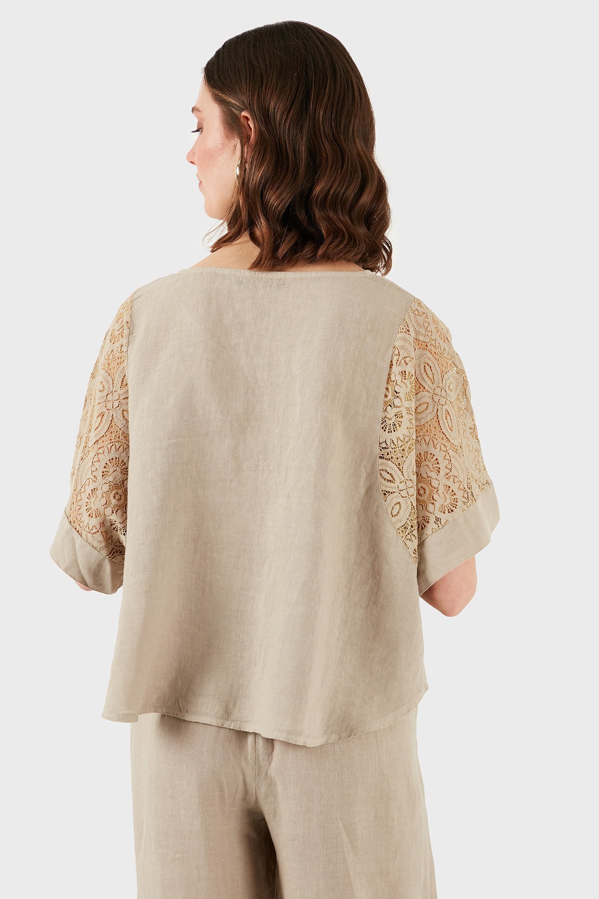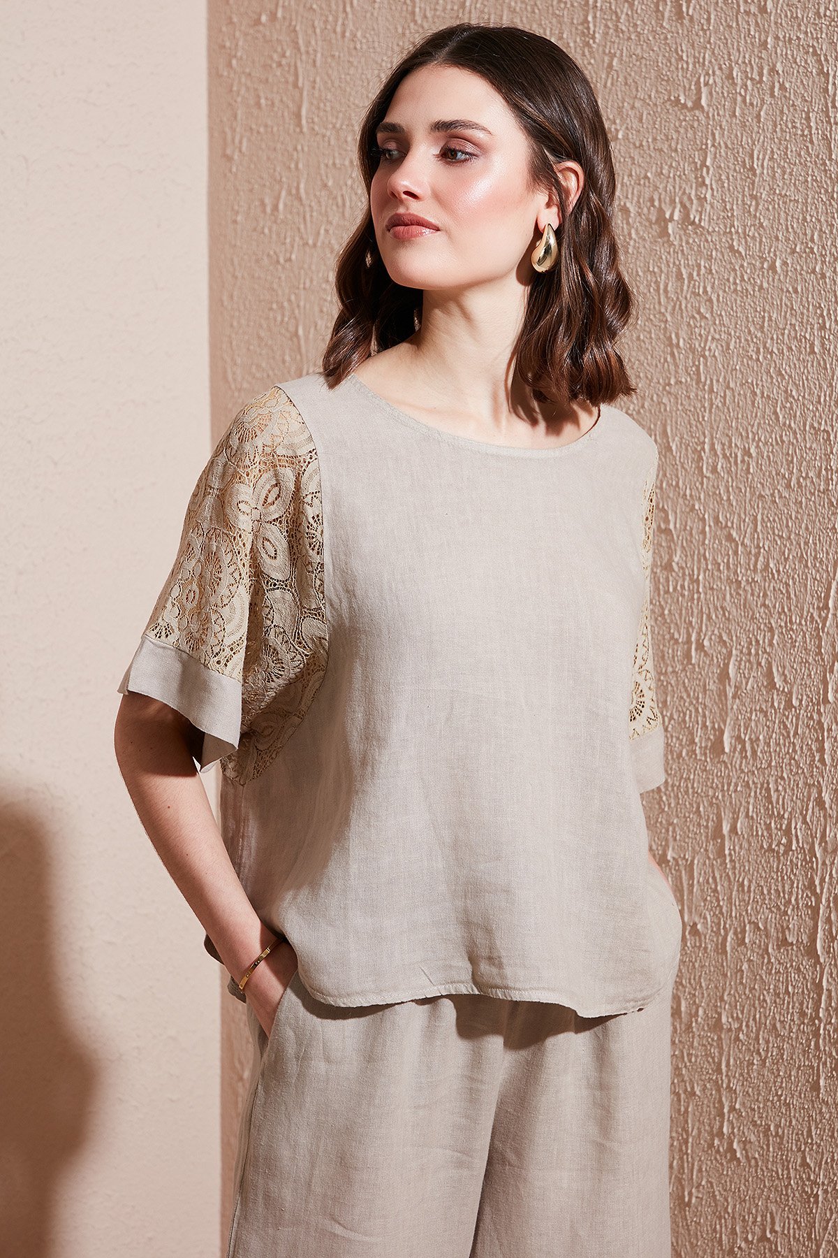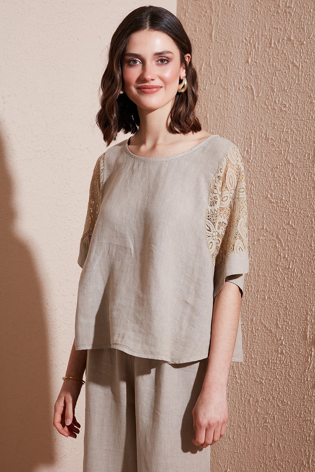 Regular Fit Dantel Detaylı Keten Bayan Bluz 7222687 TAŞ