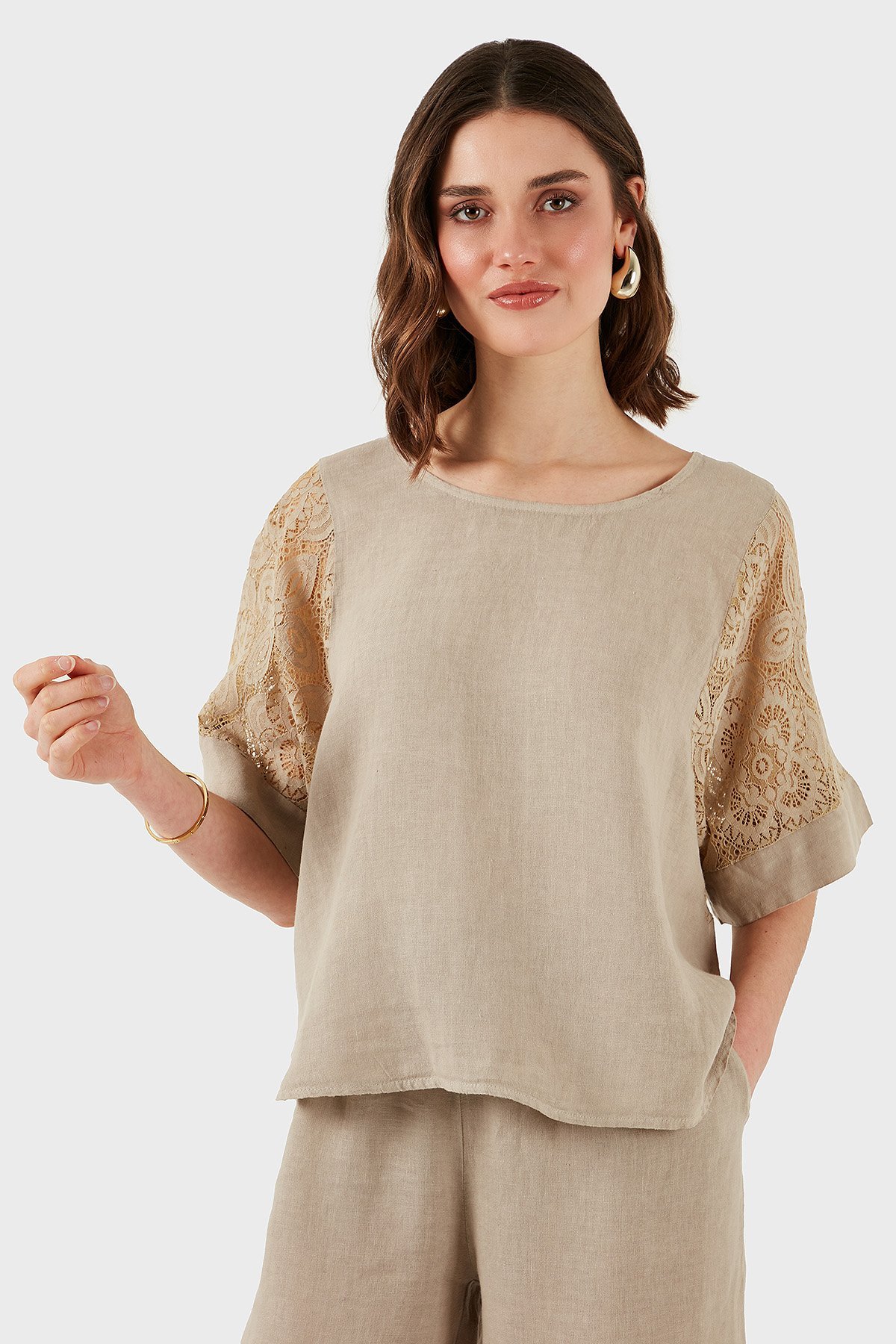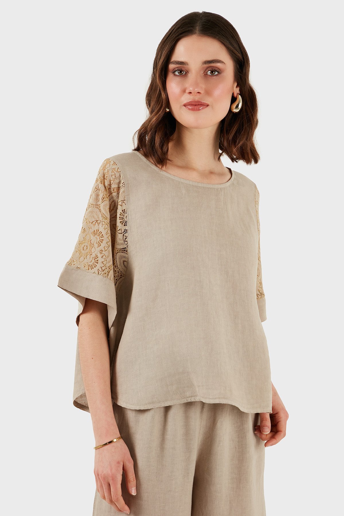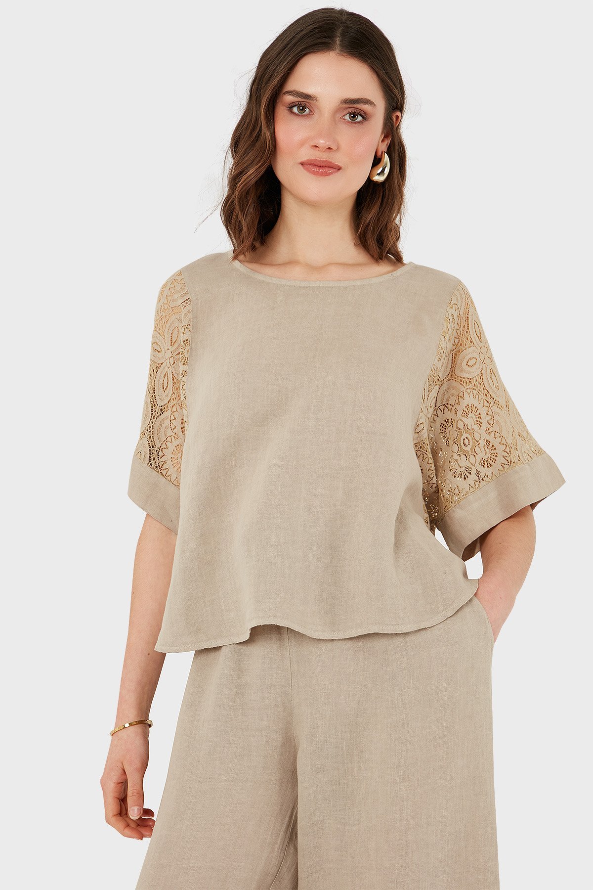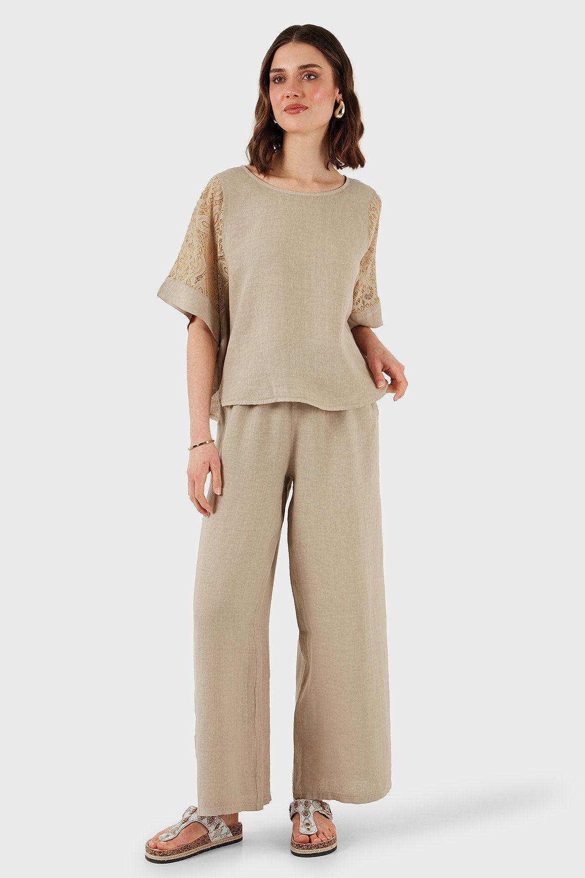 Regular Fit Dantel Detaylı Keten Bayan Bluz 7222687 TAŞ