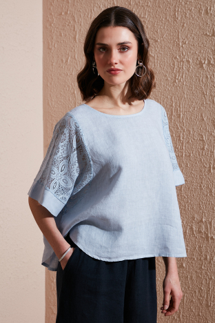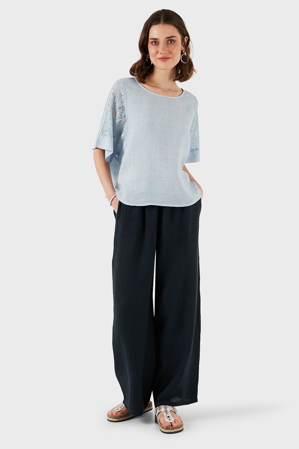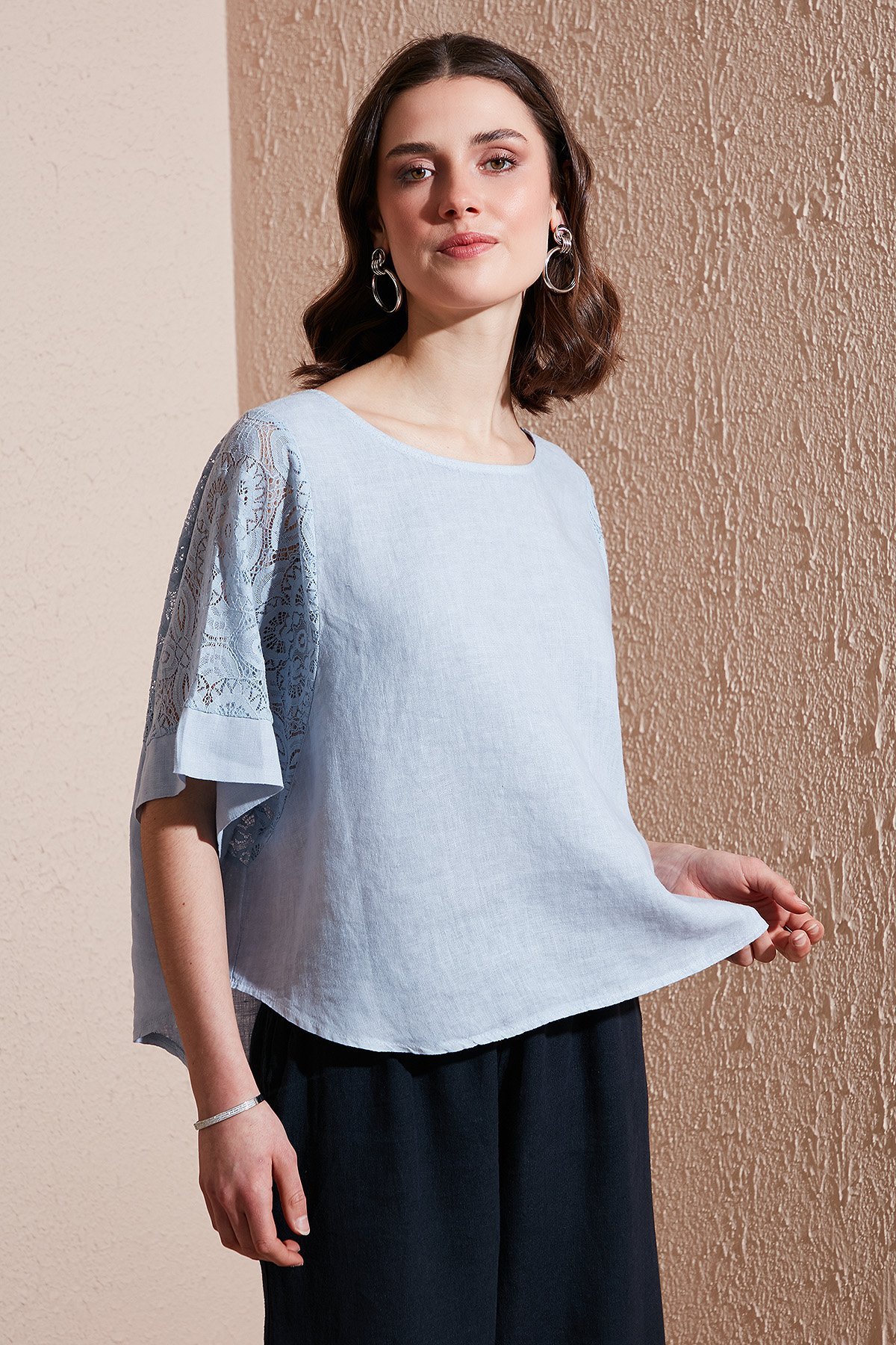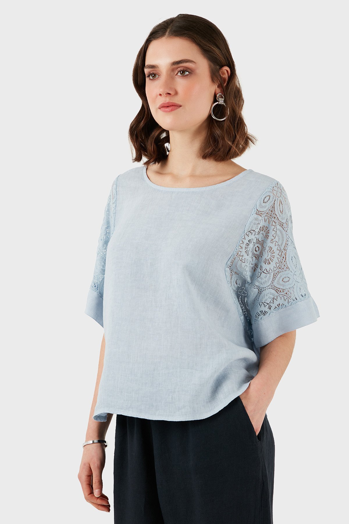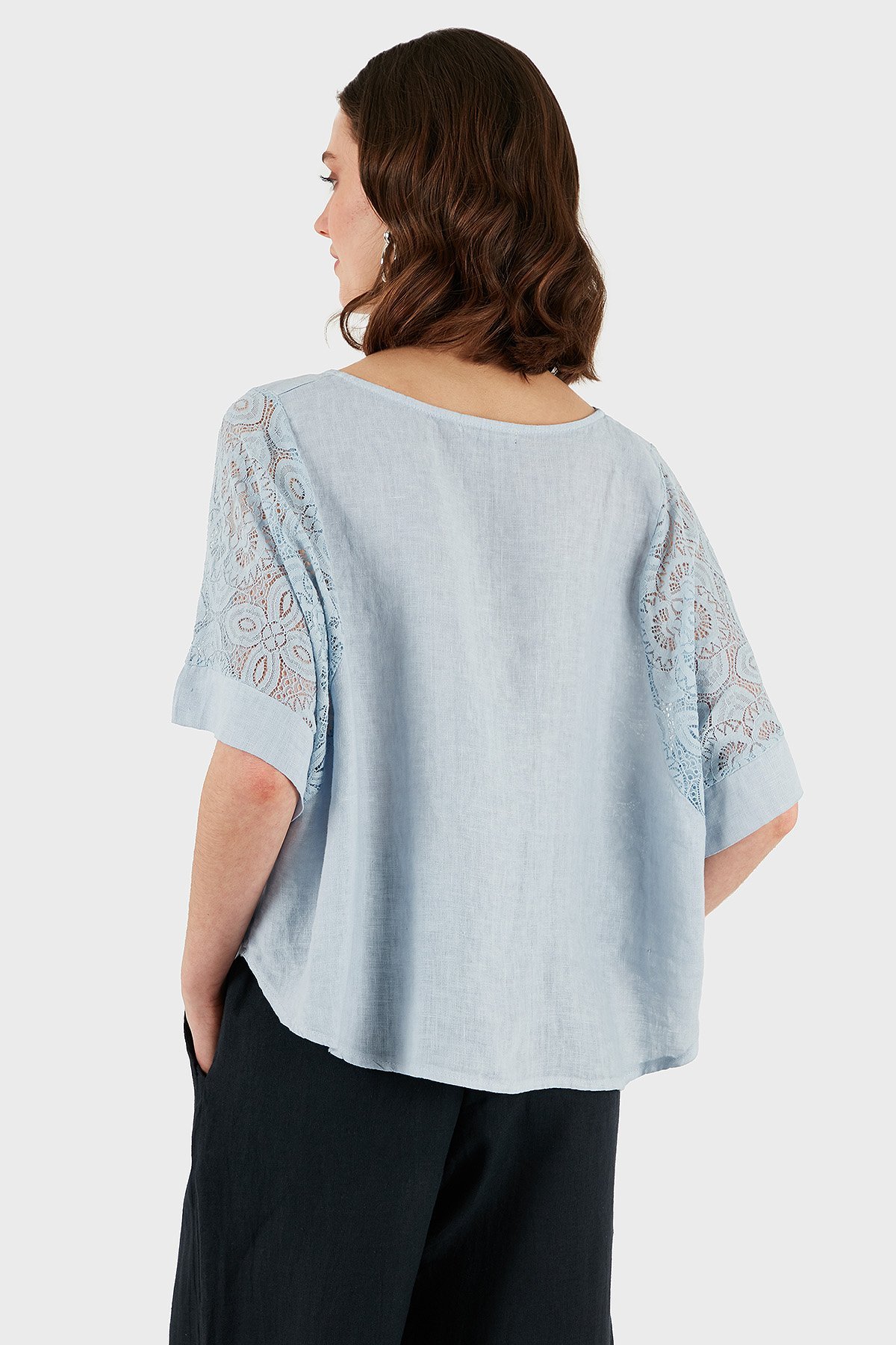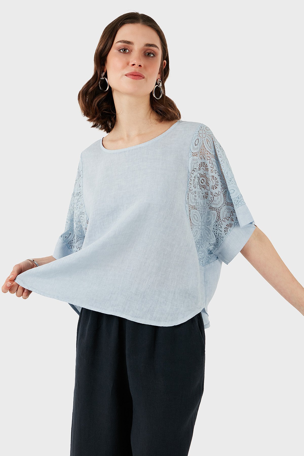 Regular Fit Dantel Detaylı Keten Bayan Bluz 7222690 AÇIK MAVİ