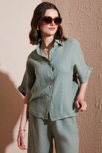 Regular Fit Düz Yaka Kısa Kollu Keten Bayan Gömlek 5028544 HAKİ
