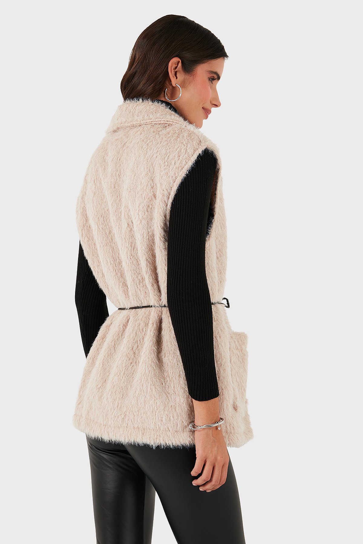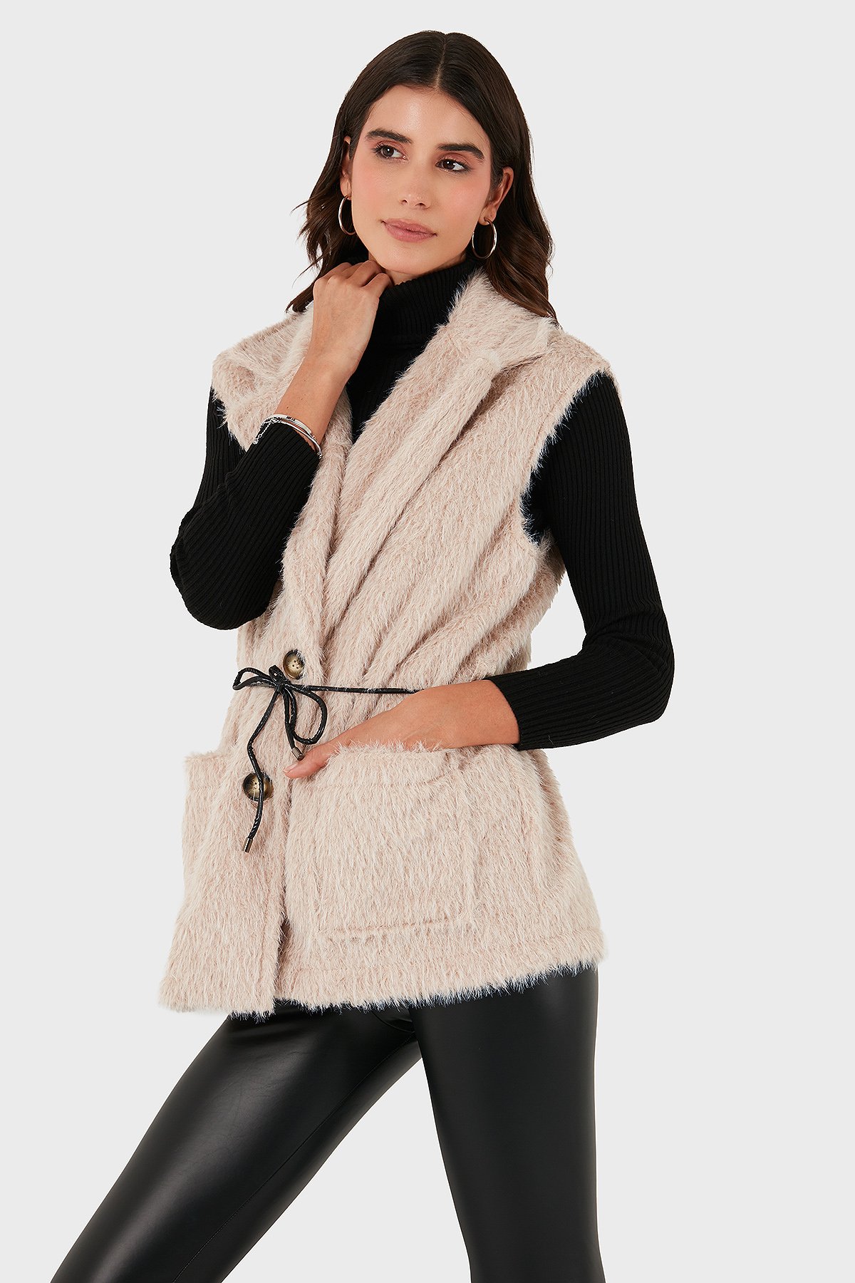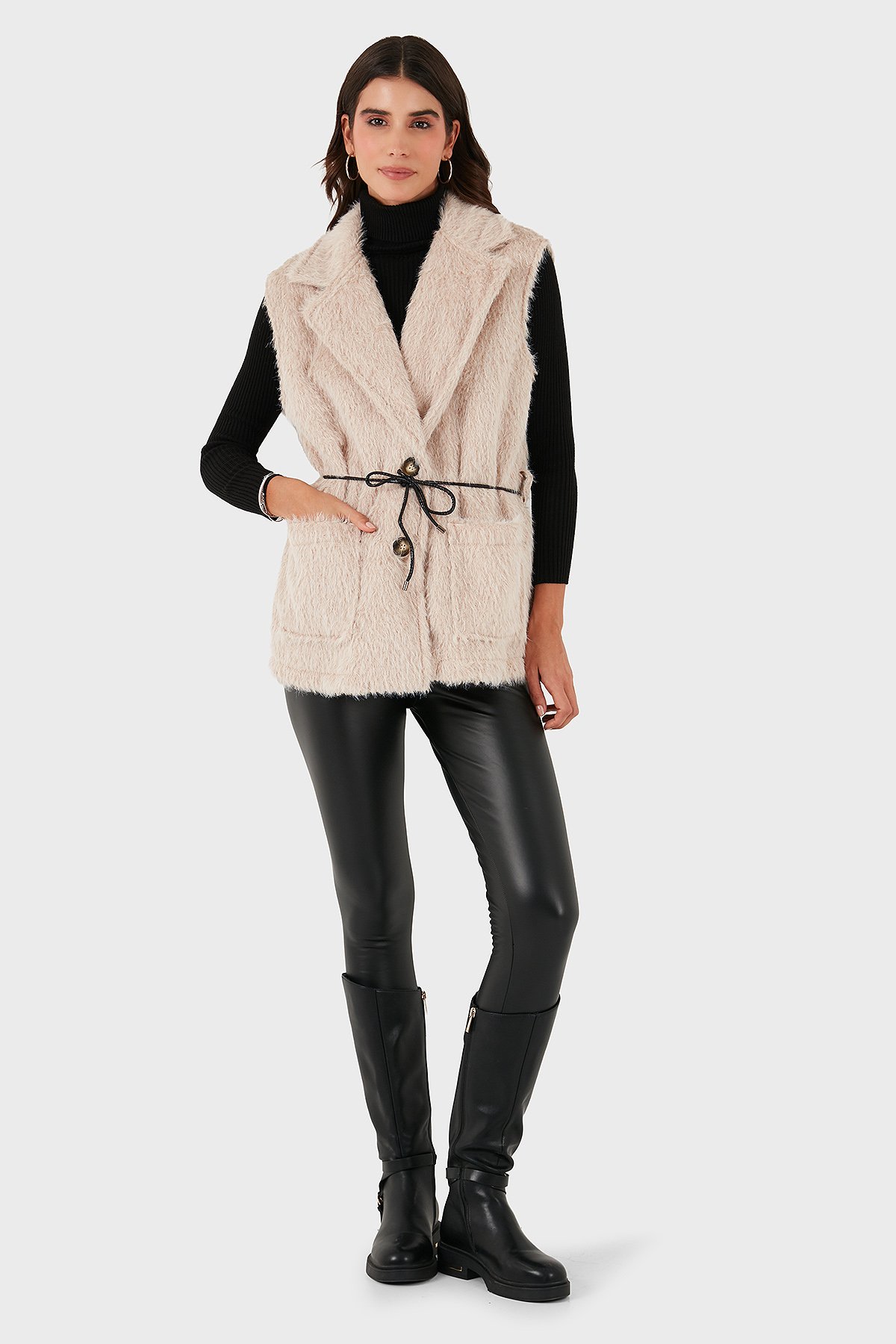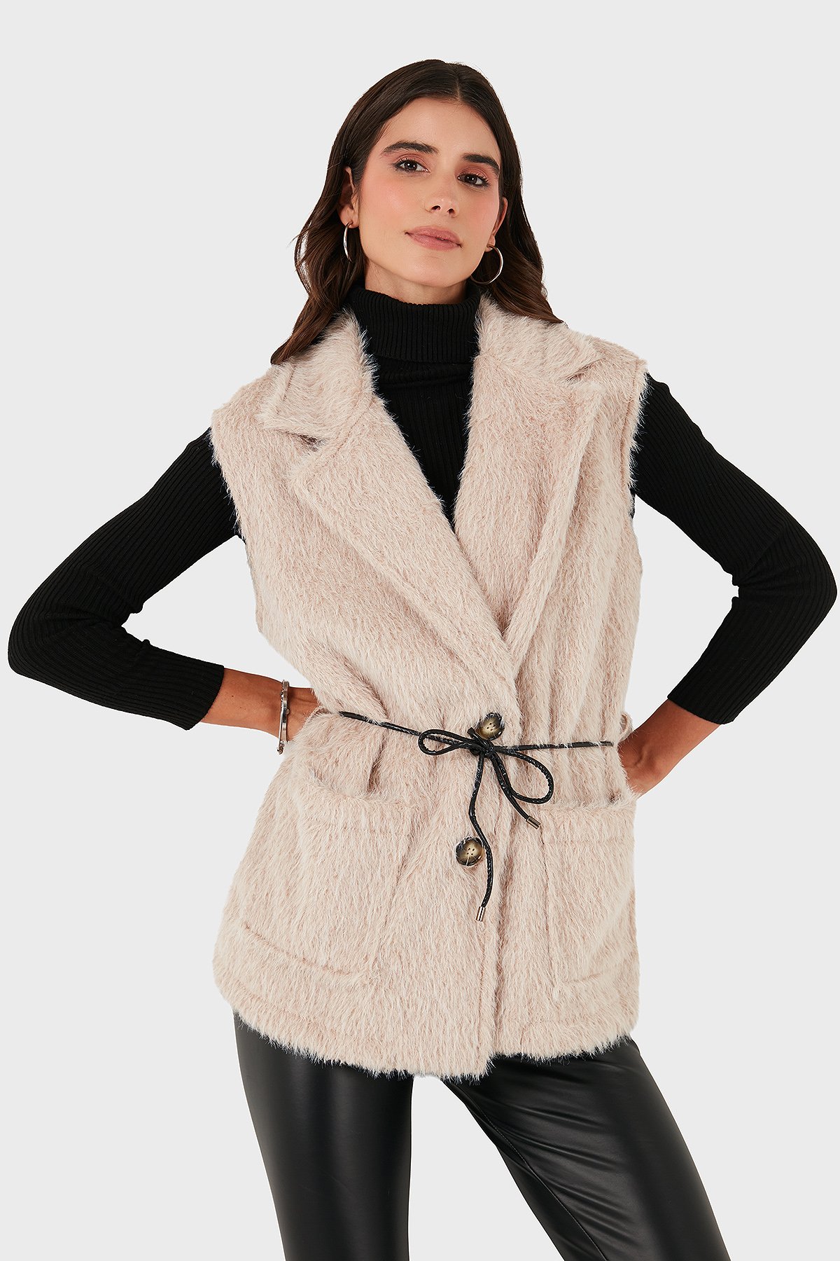 Regular Fit Kruvaze Yaka Bağlama Detaylı Kürk Bayan Yelek 68821807 BEJ