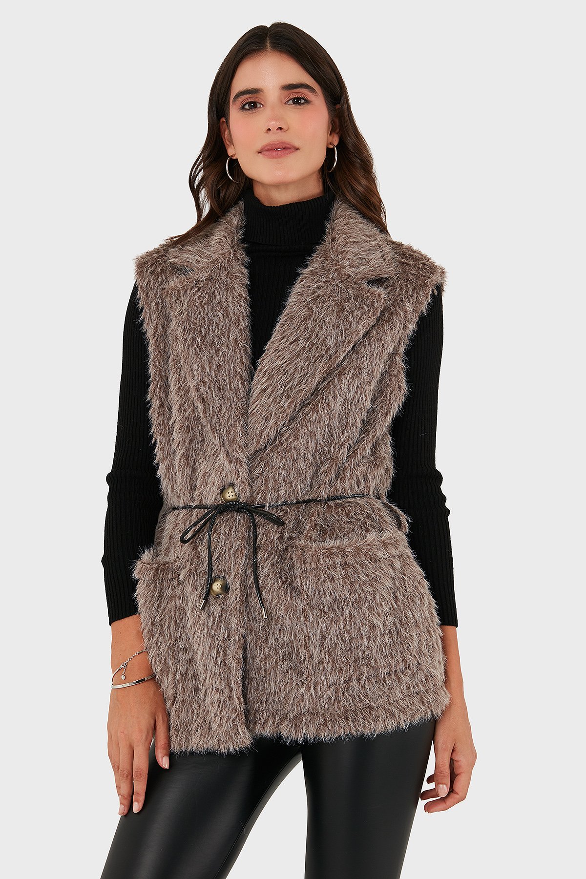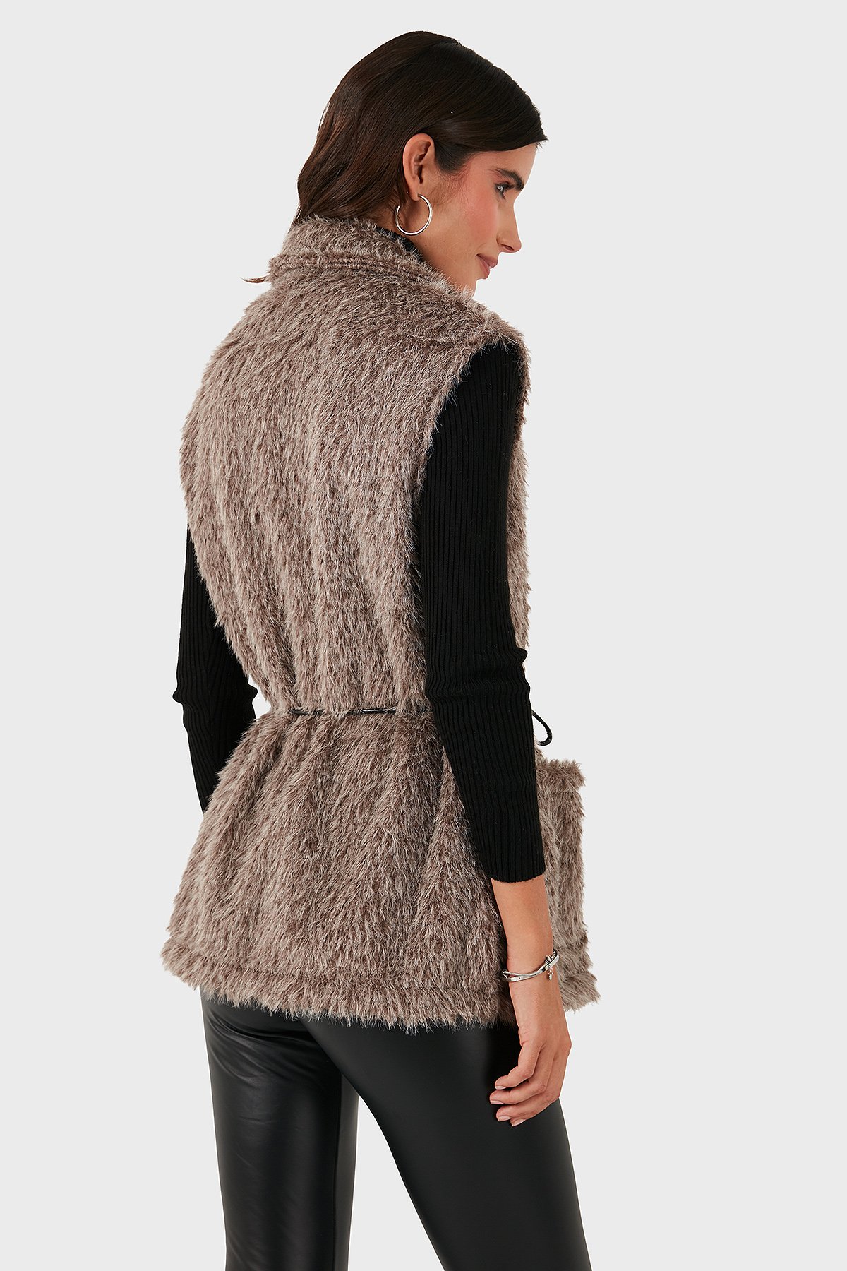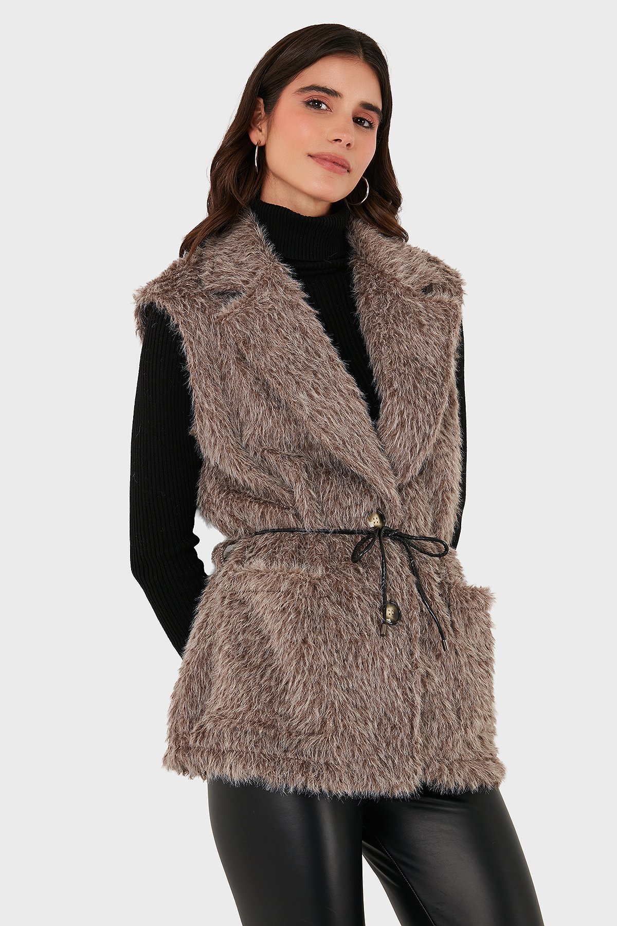 Regular Fit Kruvaze Yaka Bağlama Detaylı Kürk Bayan Yelek 68821807 VİZON