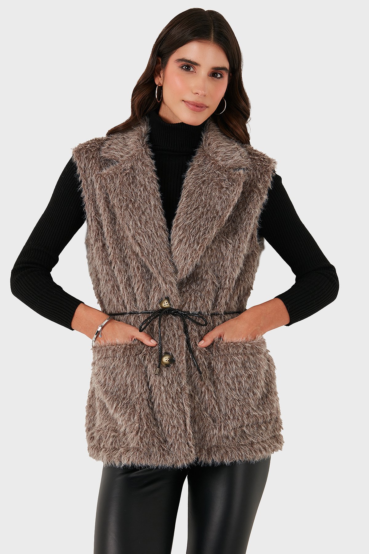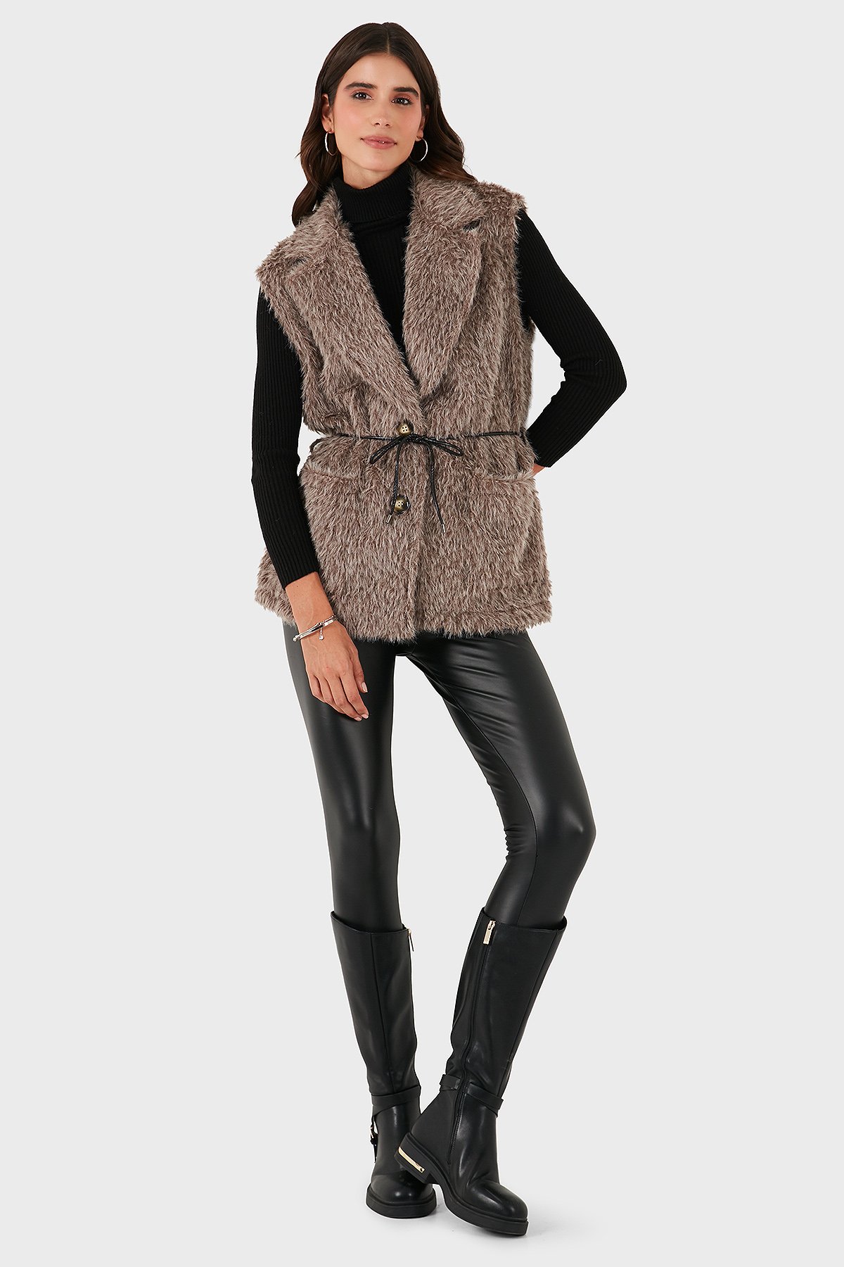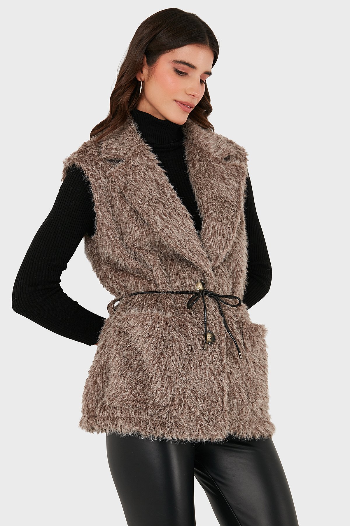 Regular Fit Kruvaze Yaka Bağlama Detaylı Kürk Bayan Yelek 68821807 VİZON
