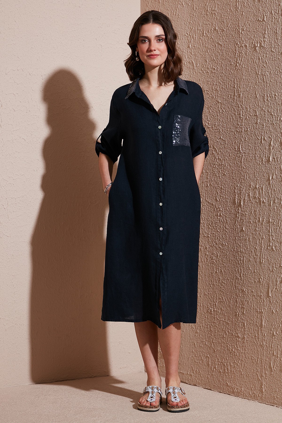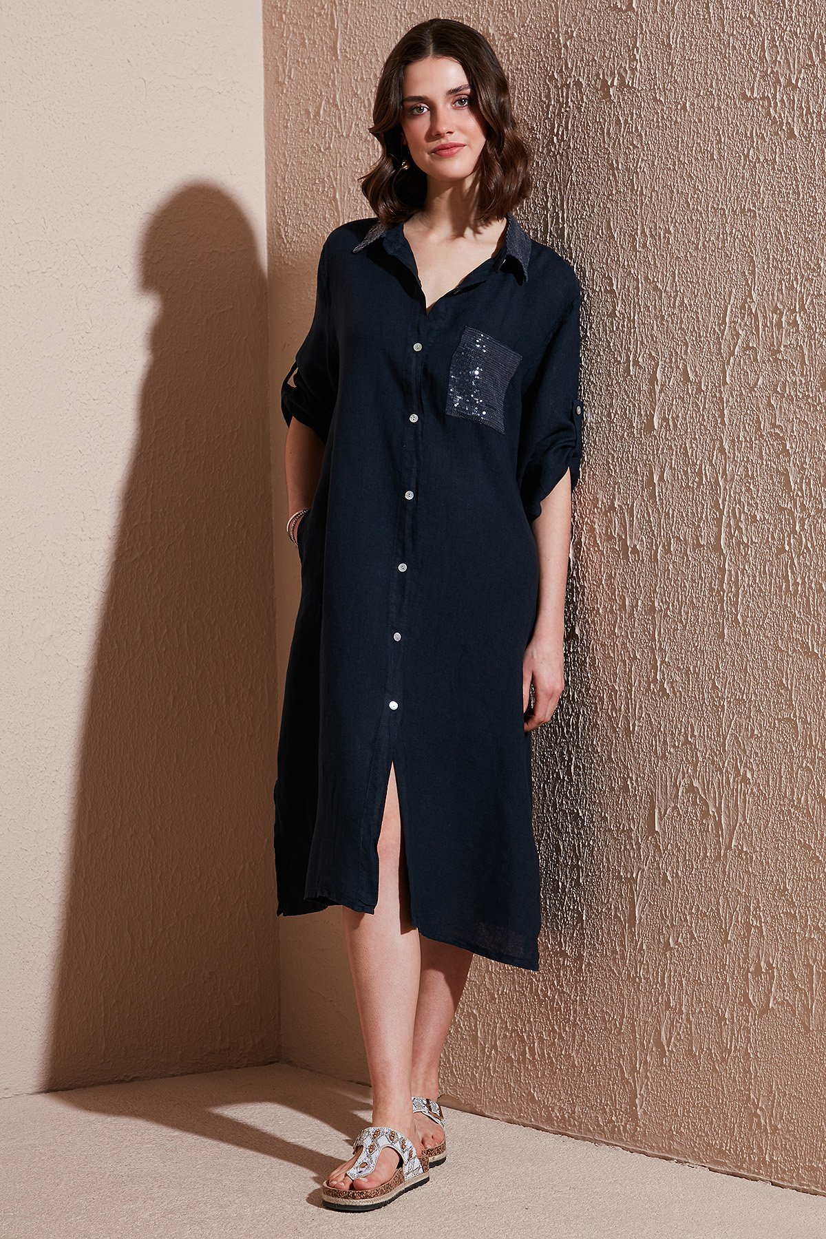 Regular Fit Truvakar Kol Midi Keten Bayan Elbise 6689194 LACİVERT