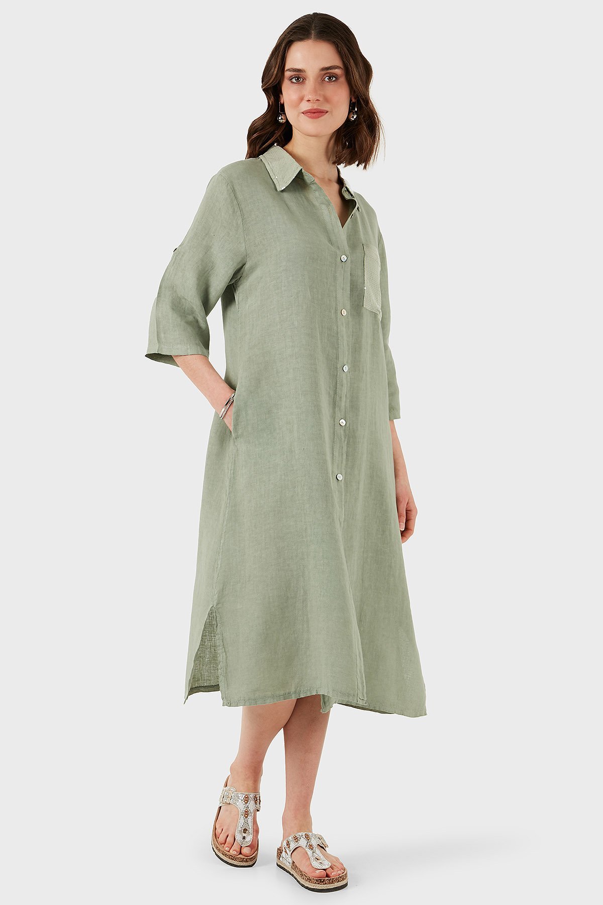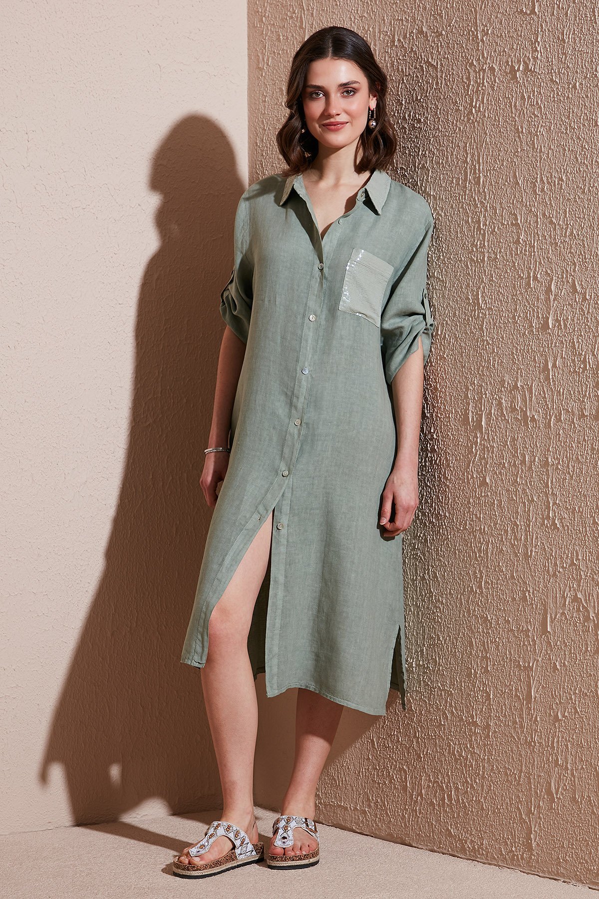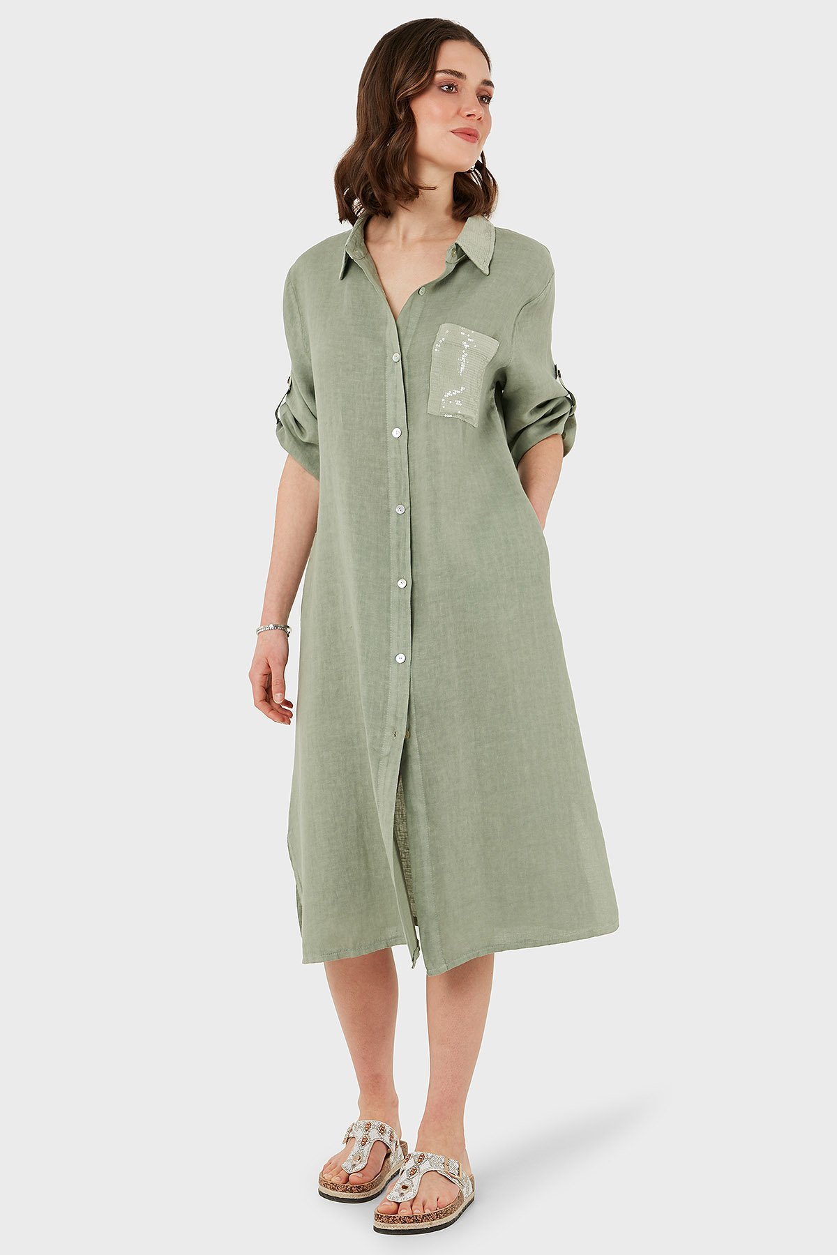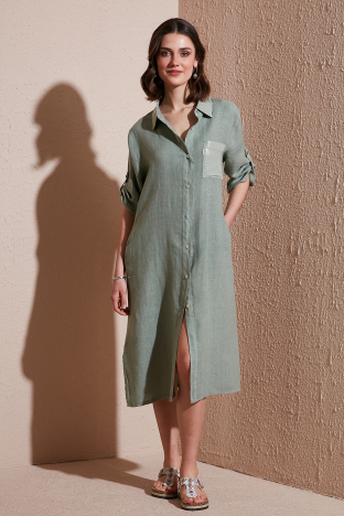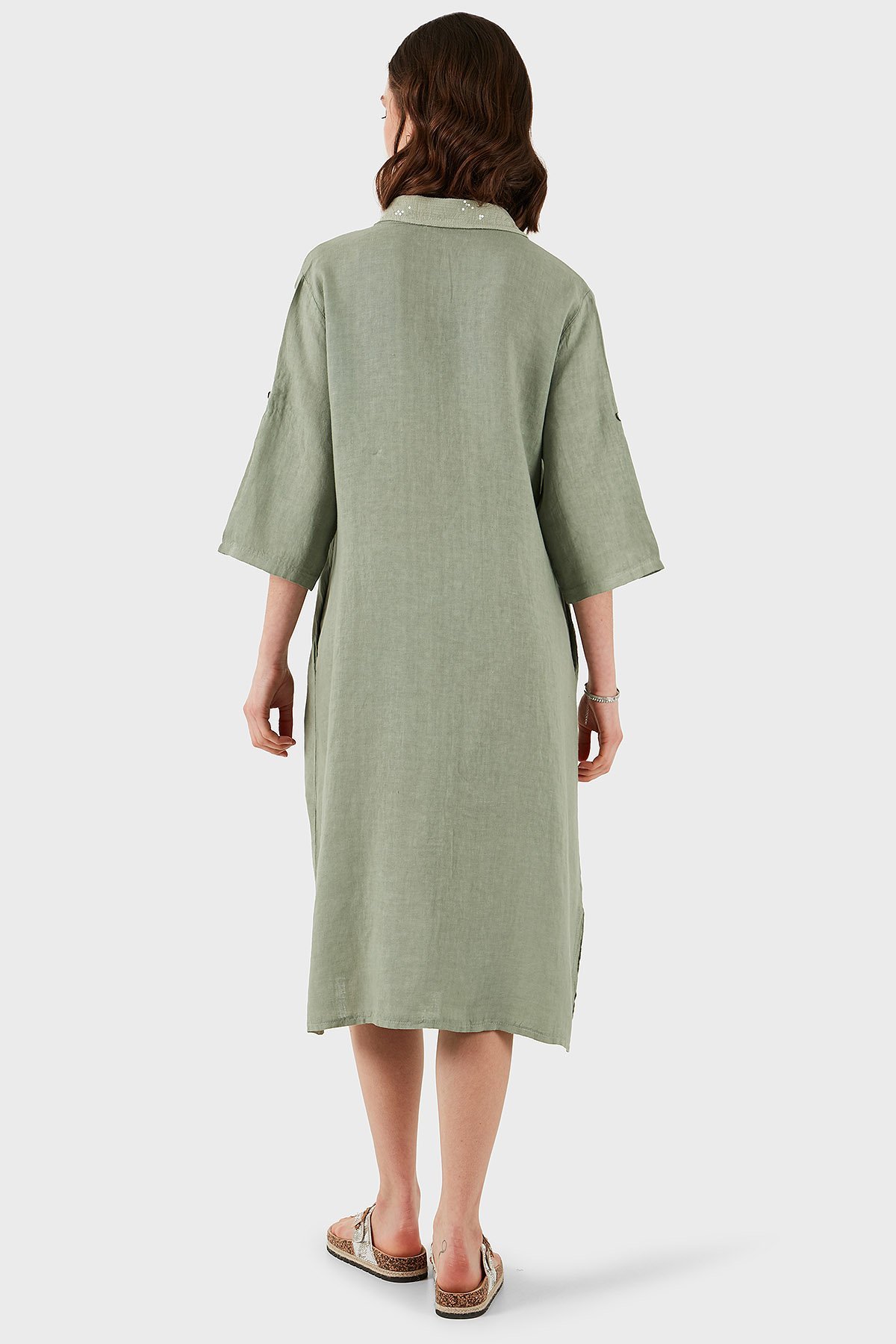 Regular Fit Truvakar Kol Midi Keten Bayan Elbise 6689544 HAKİ
