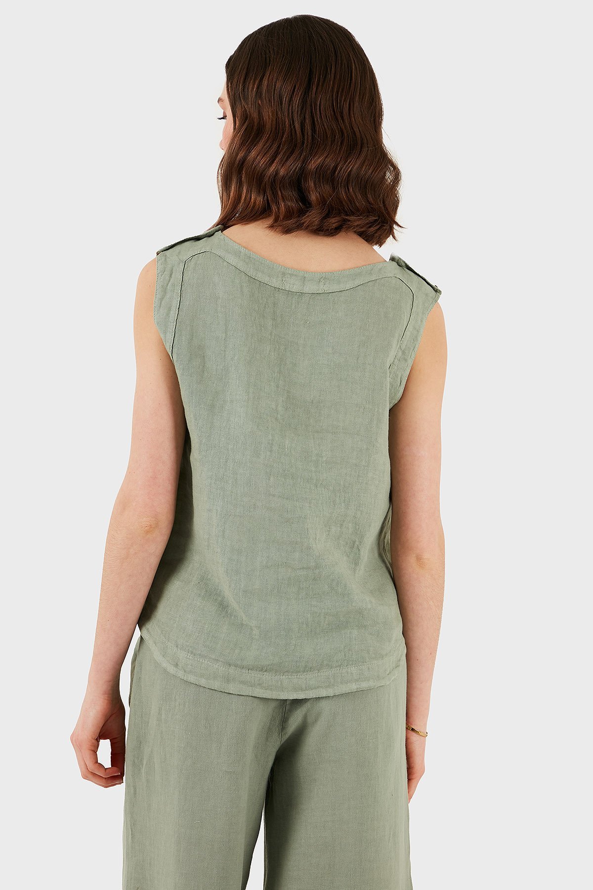 Regular Fit Yuvarlak Yaka Oval Kesim Keten Bayan Top 6251544 HAKİ
