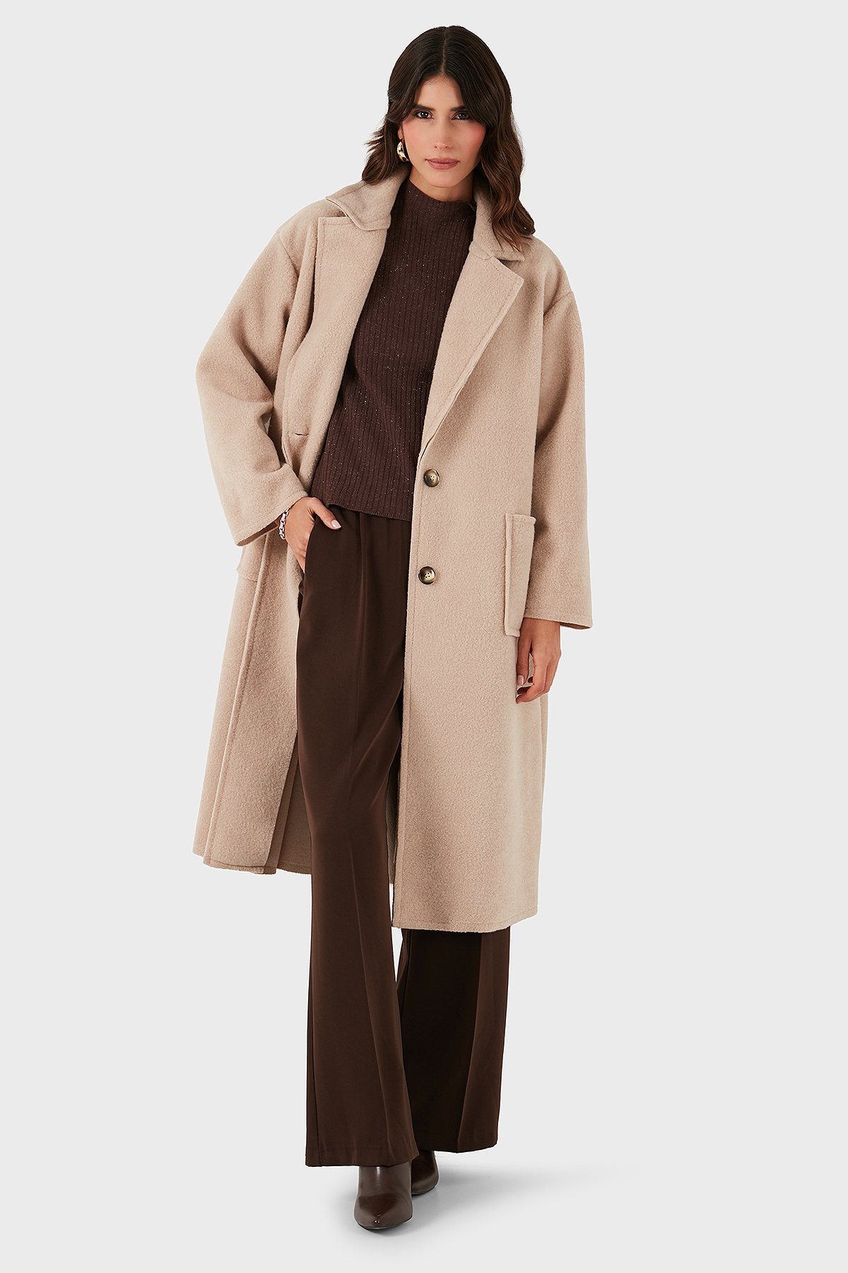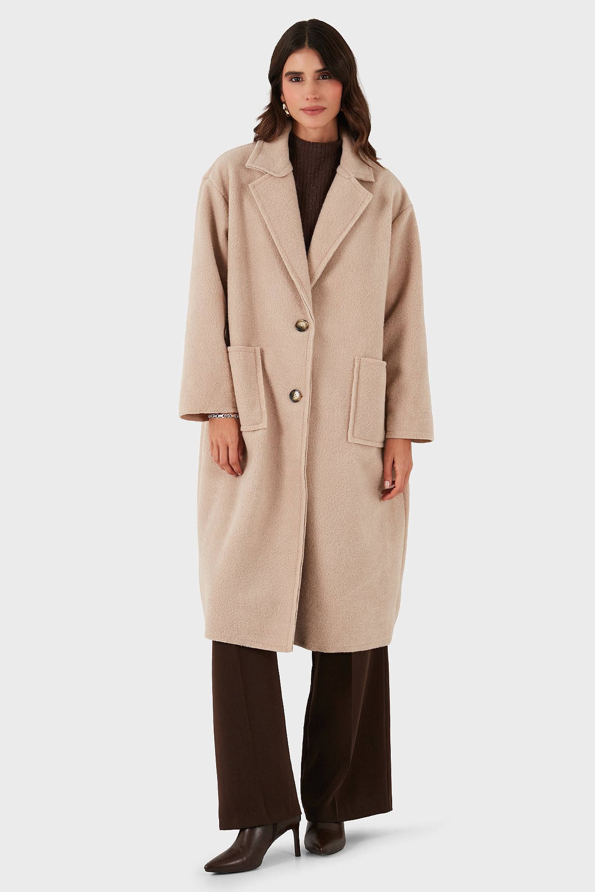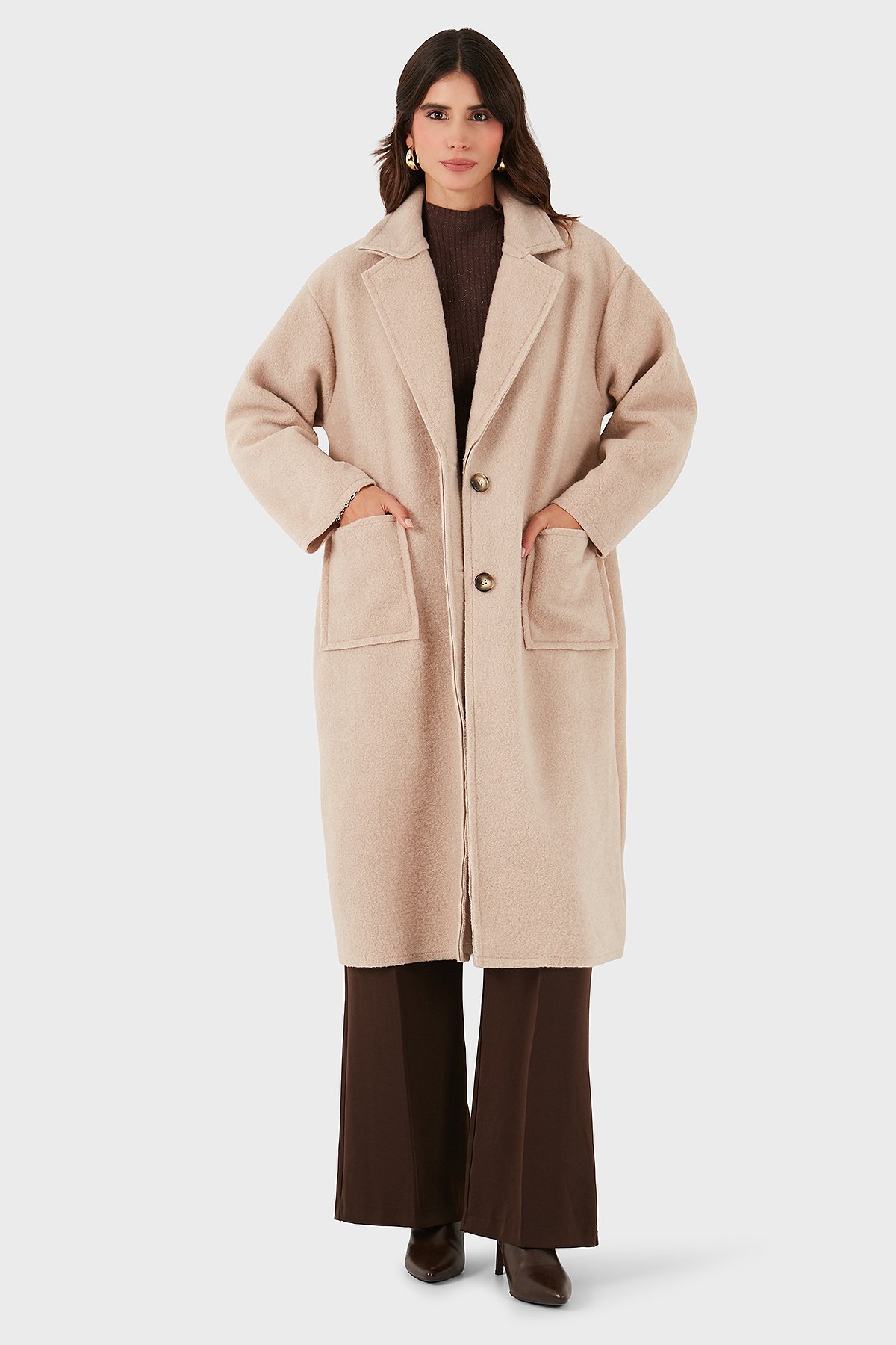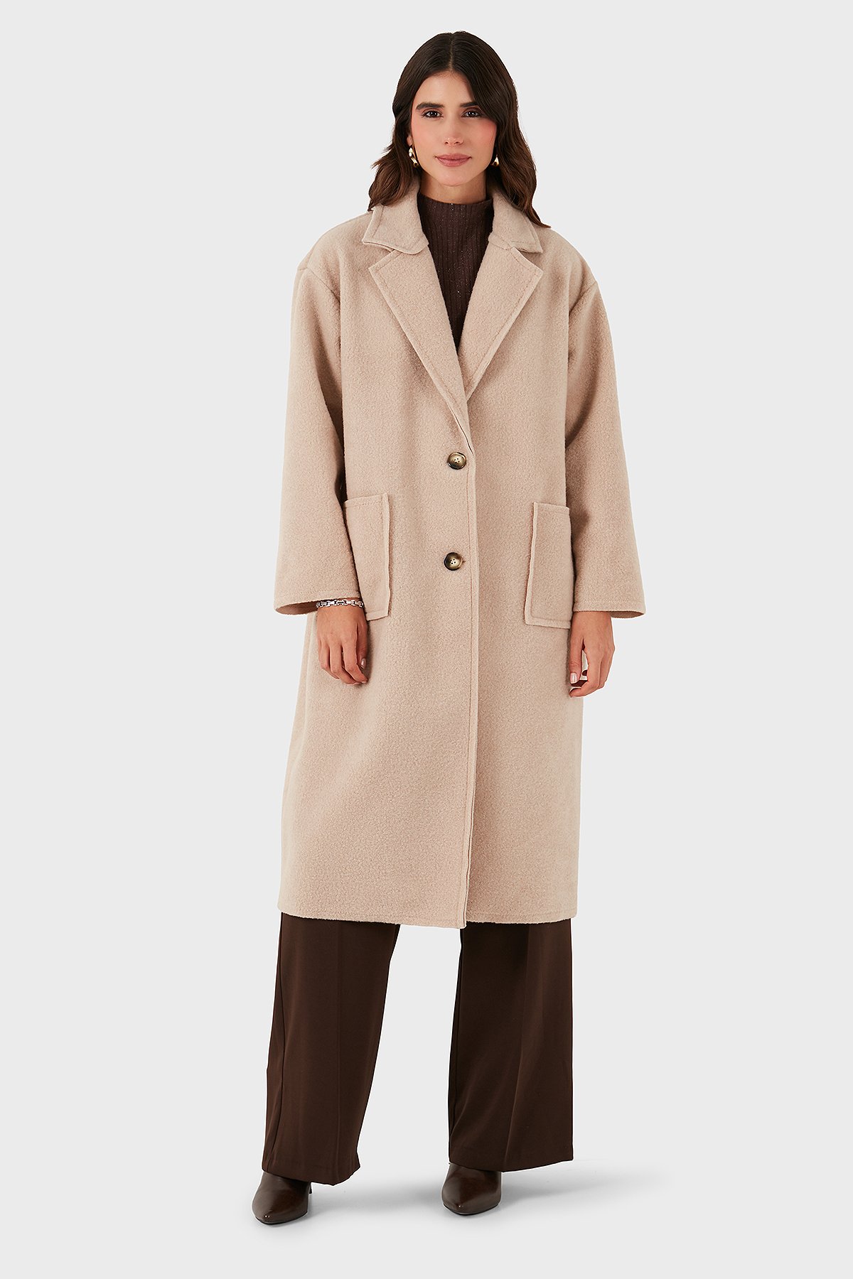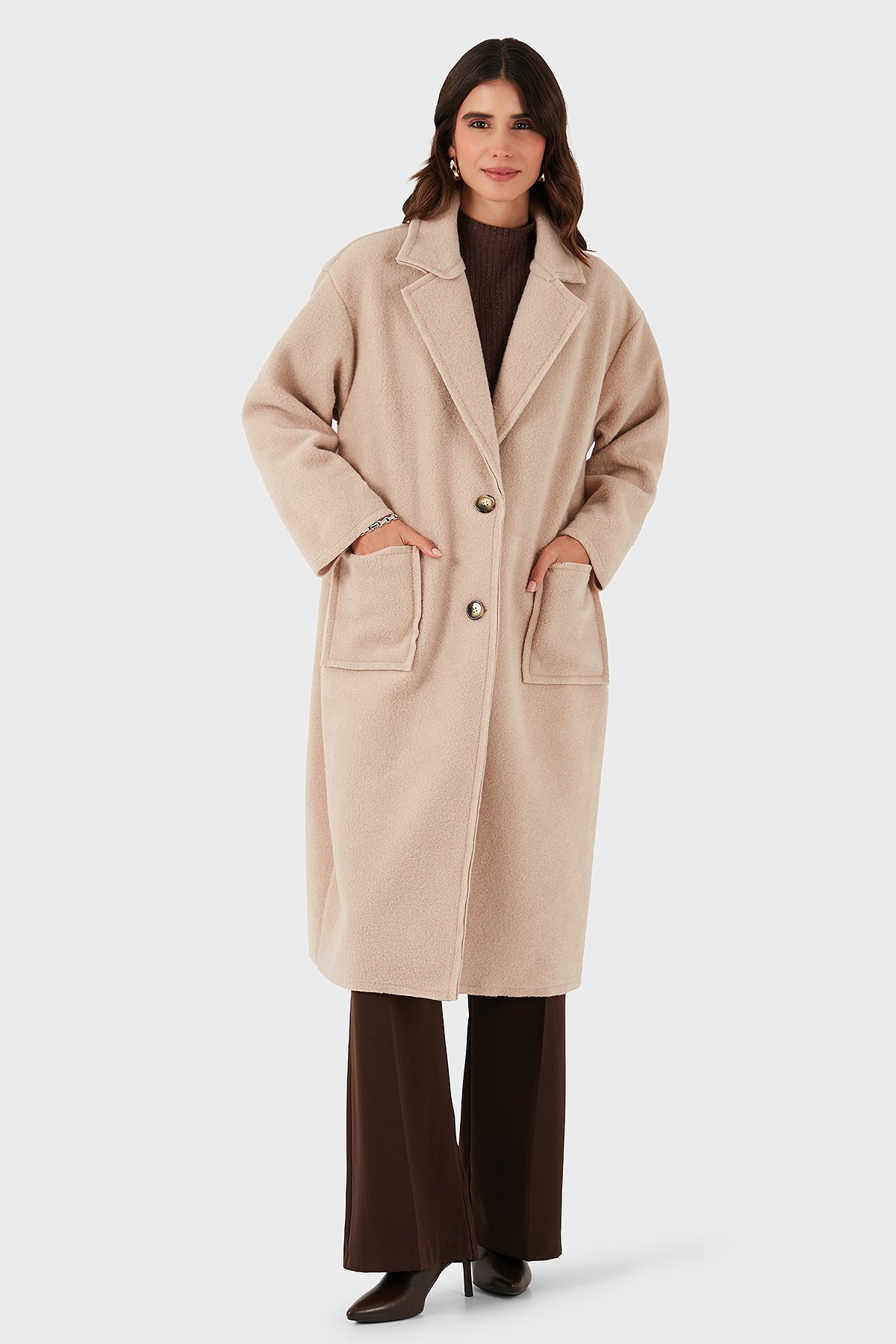 Relaxed Fit Kruvaze Yaka Düğmeli Uzun Bayan Kaban 68821012 BEJ