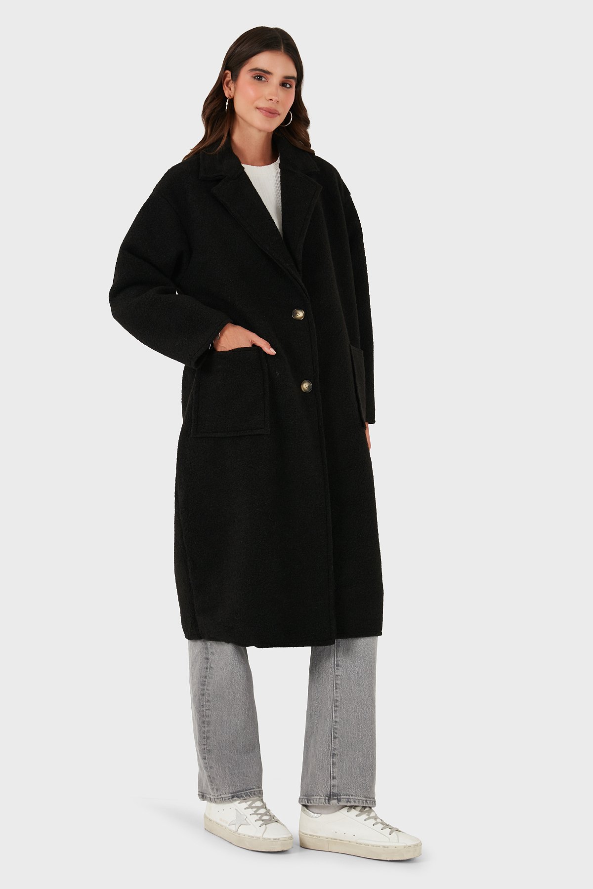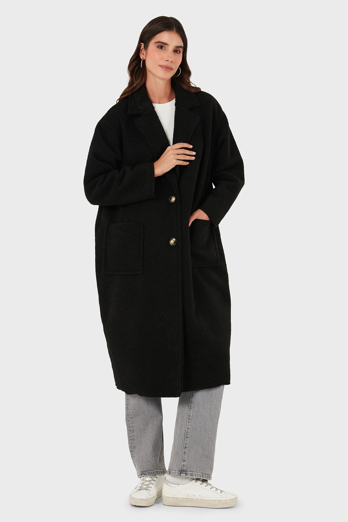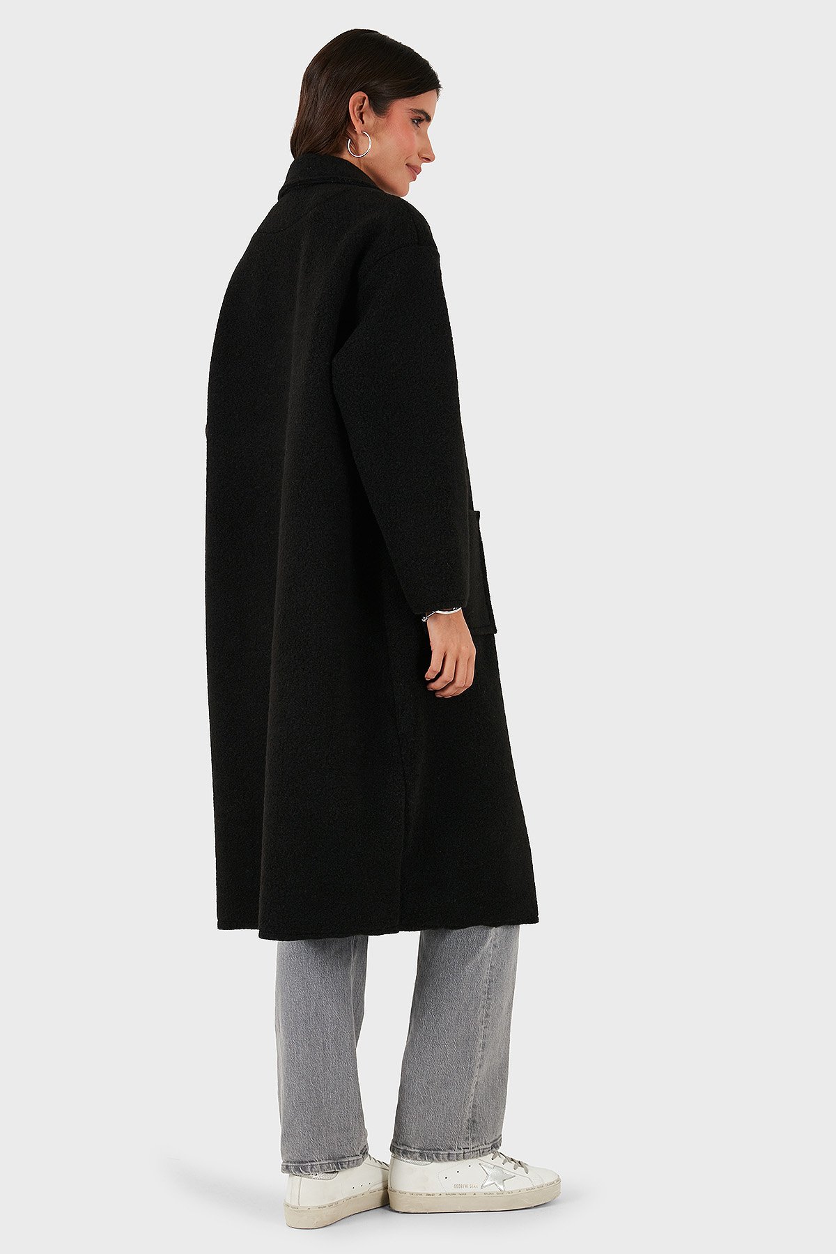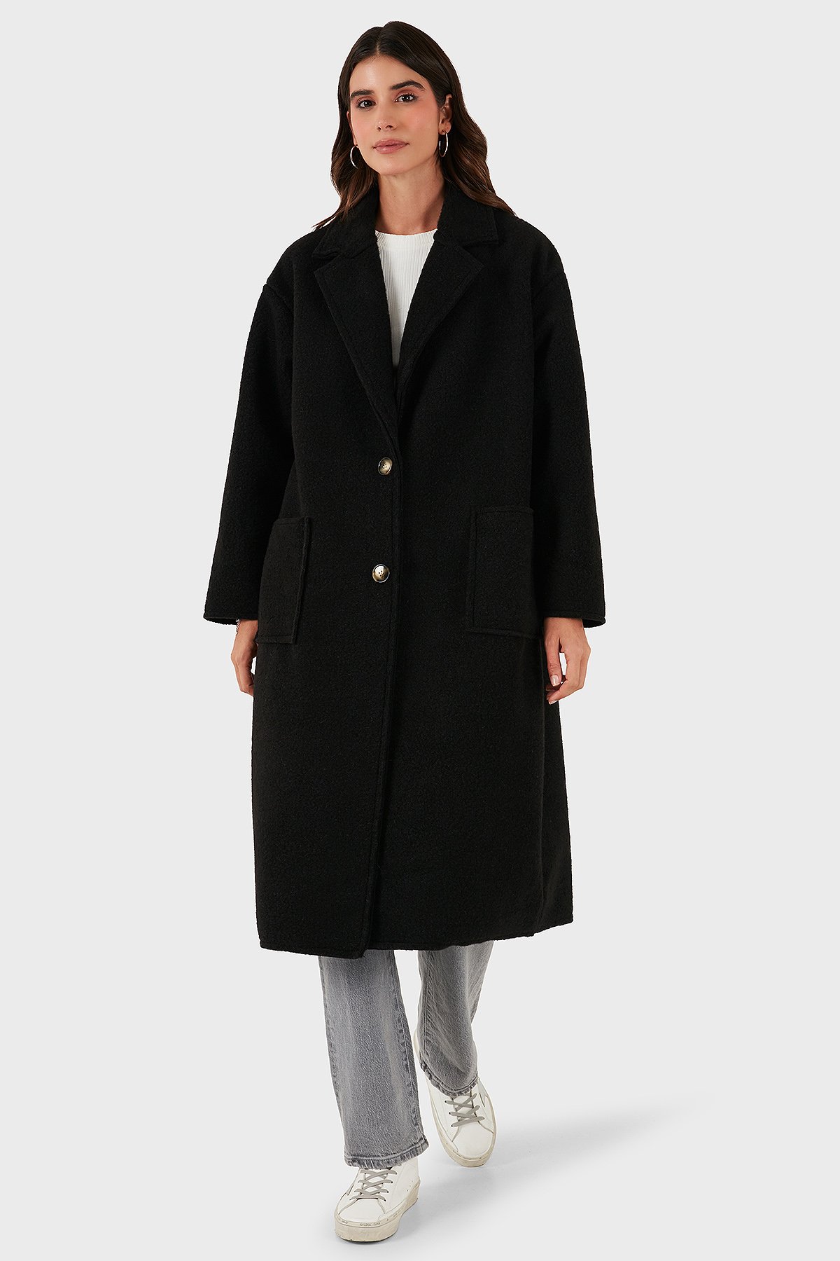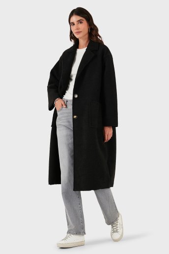 Relaxed Fit Kruvaze Yaka Düğmeli Uzun Bayan Kaban 68821012 SİYAH