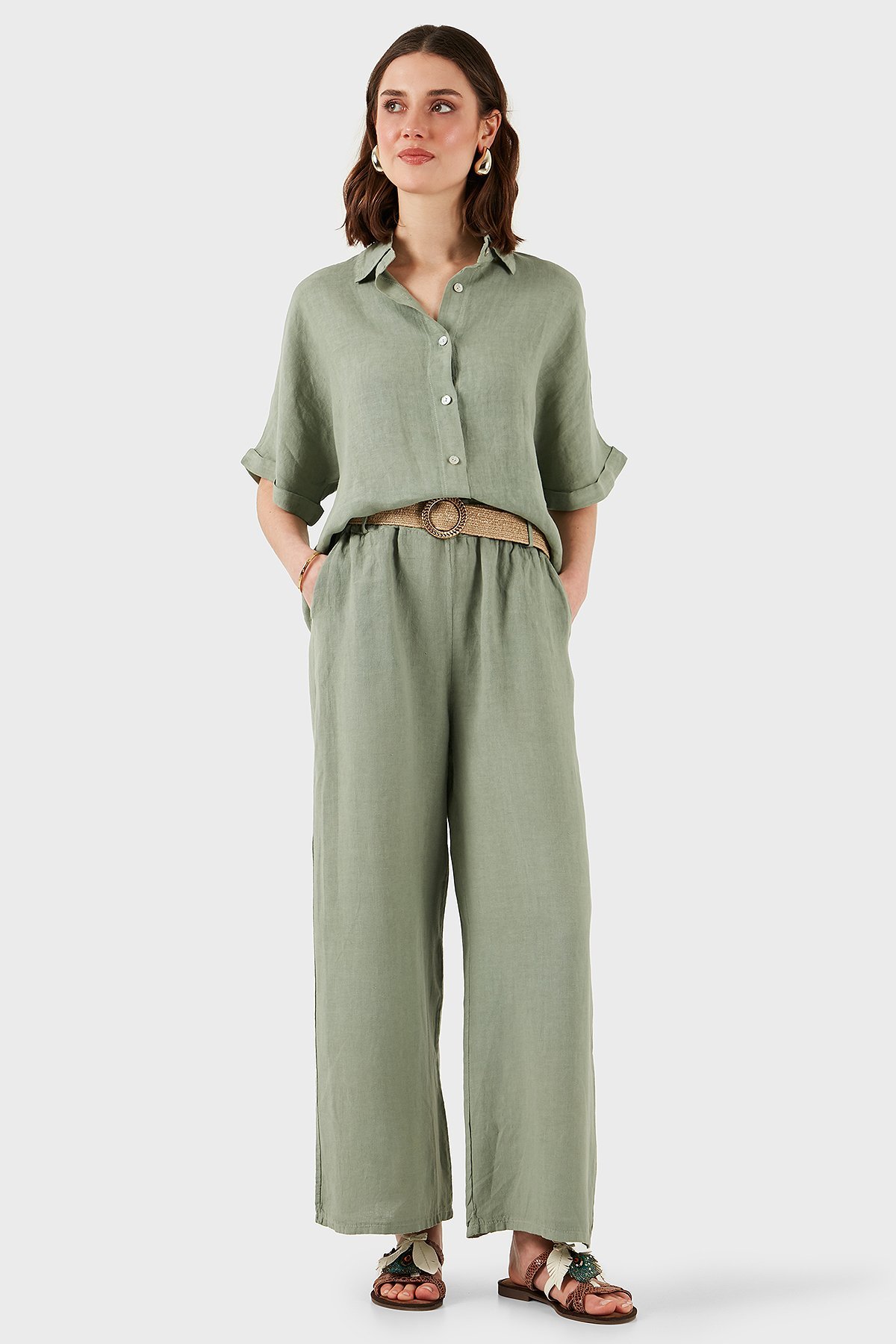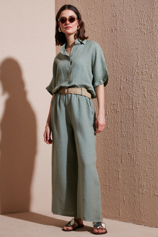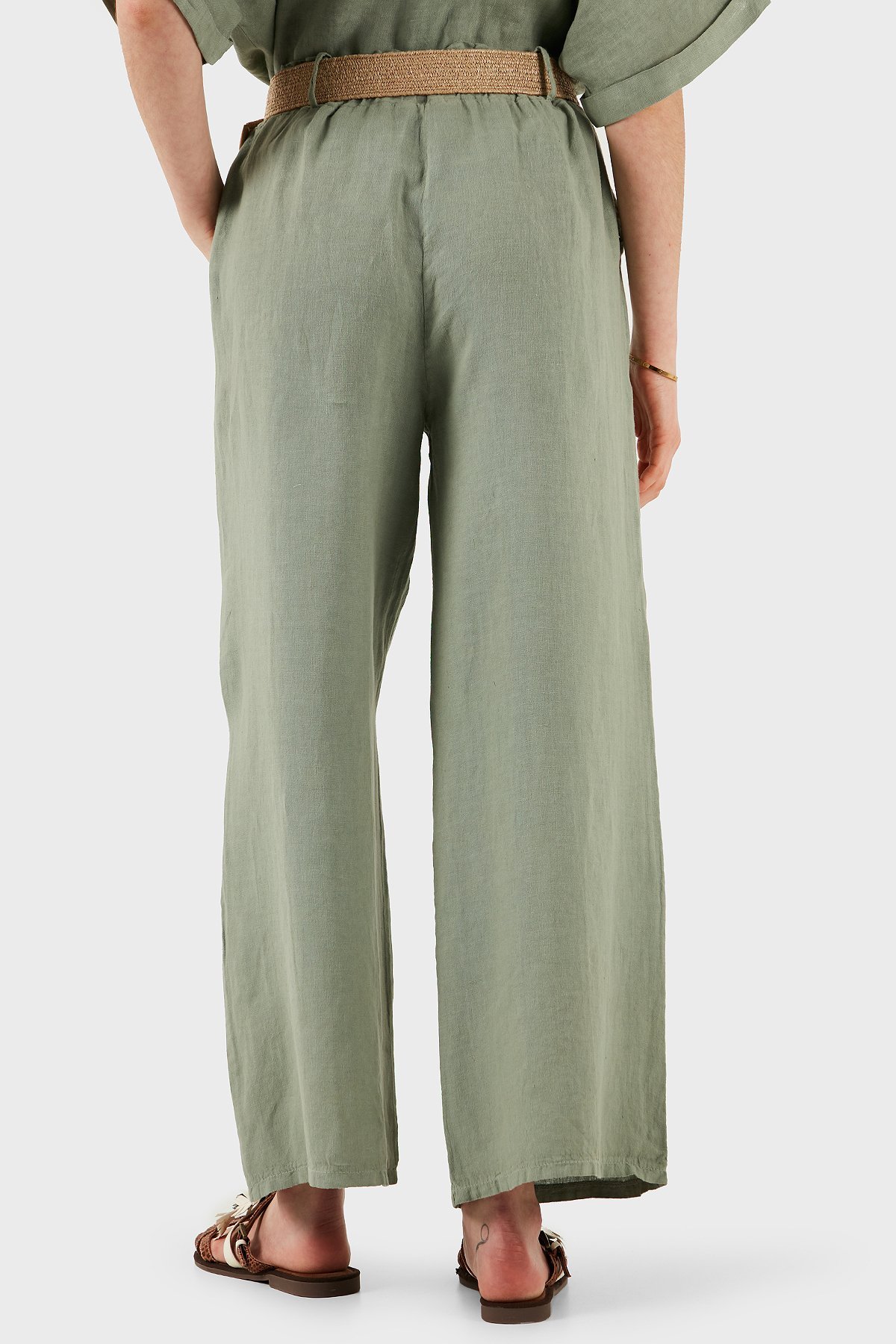 Relaxed Fit Normal Bel Bol Paça Kemerli Keten Bayan Pantolon 5056544 HAKİ