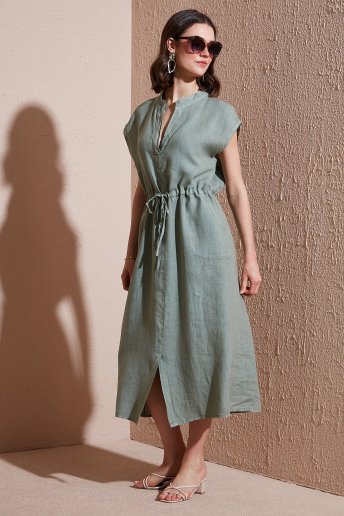 Yırtmaçlı Comfort Fit V Yaka Midi Boy Keten Bayan Elbise 6085544 HAKİ